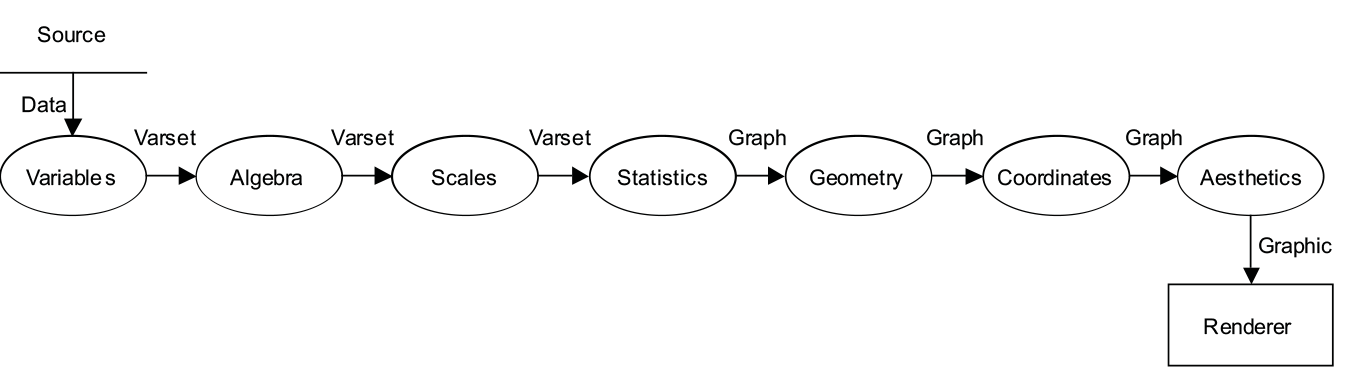 This dataflow is a chain that describes the sequence of mappings needed to produce a statistical graphic from a set of data. The first component Variables maps data to an object called a dataset (a set of variables). The next three components Algebra, Scales, Statistics are transformations on datasets. The next component Geometry maps a dataset to a graph and the next Coordinates embeds a graph in a coordinate space. The last component Aesthetics maps a graph to a visible or perceivable display called a graphic.