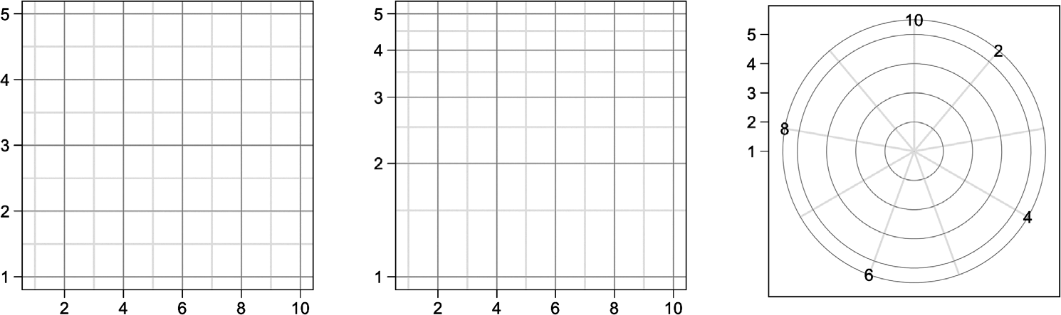 The most popular types of charts employ Cartesian coordinates. The same real tuples in the graphs underlying these graphics can be embedded in many other coordinate systems, however. There are many reasons for displaying graphics in different coordinate systems. One reason is to simplify. For example, coordinate transformations can change some curvilinear graphics to linear. Another reason is to reshape graphics so that important variation or covariation is more salient or accurately perceived. Each Co-ordinate system will have its own mapping values (For Cartesian: x and y, Polar: Theta and Radius). Similarly it would have a Scale (xlim, ylim, xtrans and ytrans) which can be used to produce log/semi-log scales scales. Co-ordinate Layer will also contain a boolean,Flip, Fractional, Ration which would decide the output size of the graph and String, Title