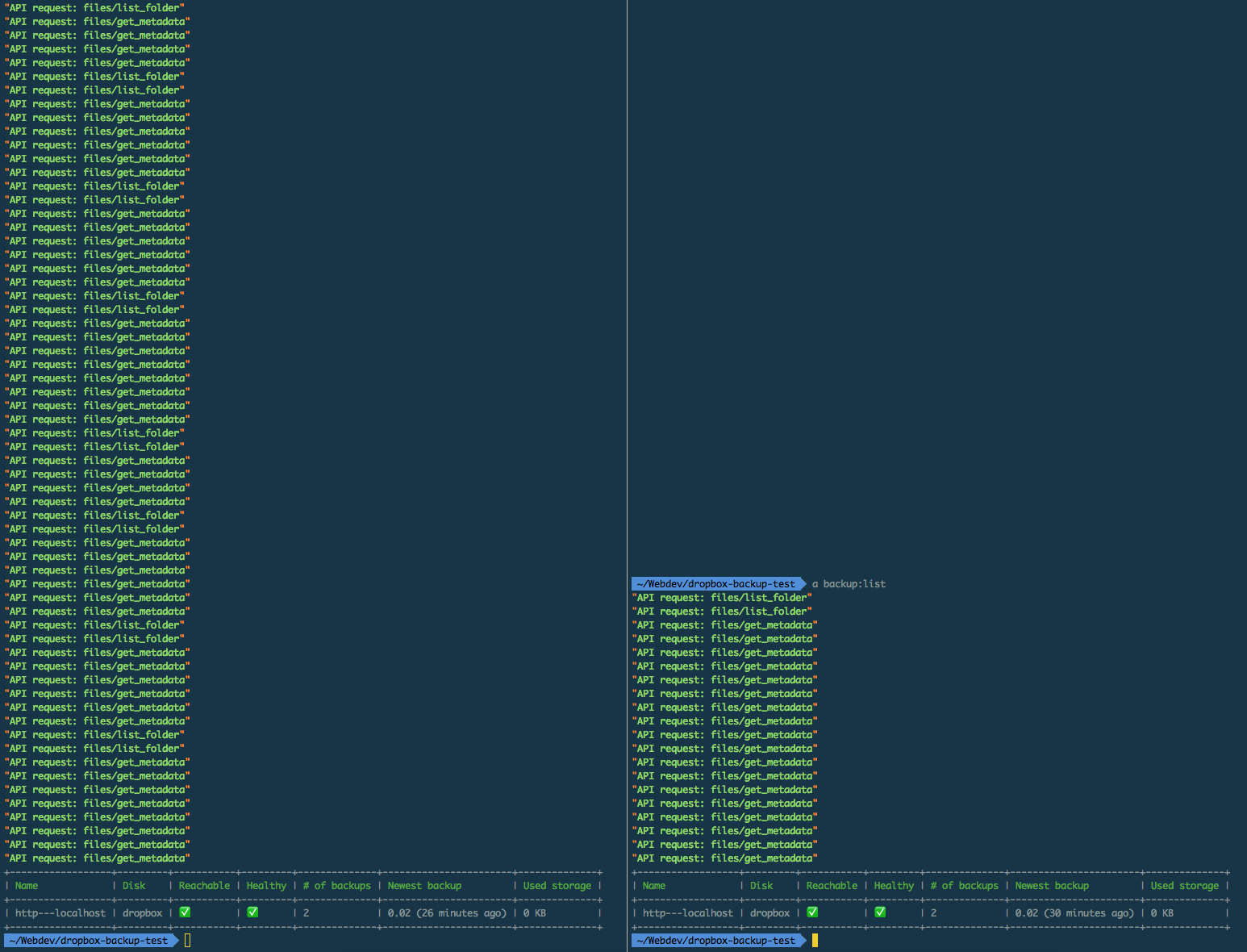 De rest van de dag probeer ik bij wijze van ultieme integratietest de Dropbox driver te gebruiken in het backup pakket. Iets dat ik waarschijnlijk zelf ook zal gebruiken zo. Dat ging op eerste zicht zonder problemen maar bij het oplijsten van de backups ging het mis. Zo duurde het redelijk lang (3 minuten) om gewoon een lijstje van 2 backups weer te geven... Na een beetje debuggen werd het duidelijk dat heel wat simpele filesystems calls (zoals bv. kijken of een bestand bestaat) meerdere keren werden uitgevoerd binnen de dezelfde backup collectie. Meerdere keren was in dit geval 90 keer voor 2 backups.