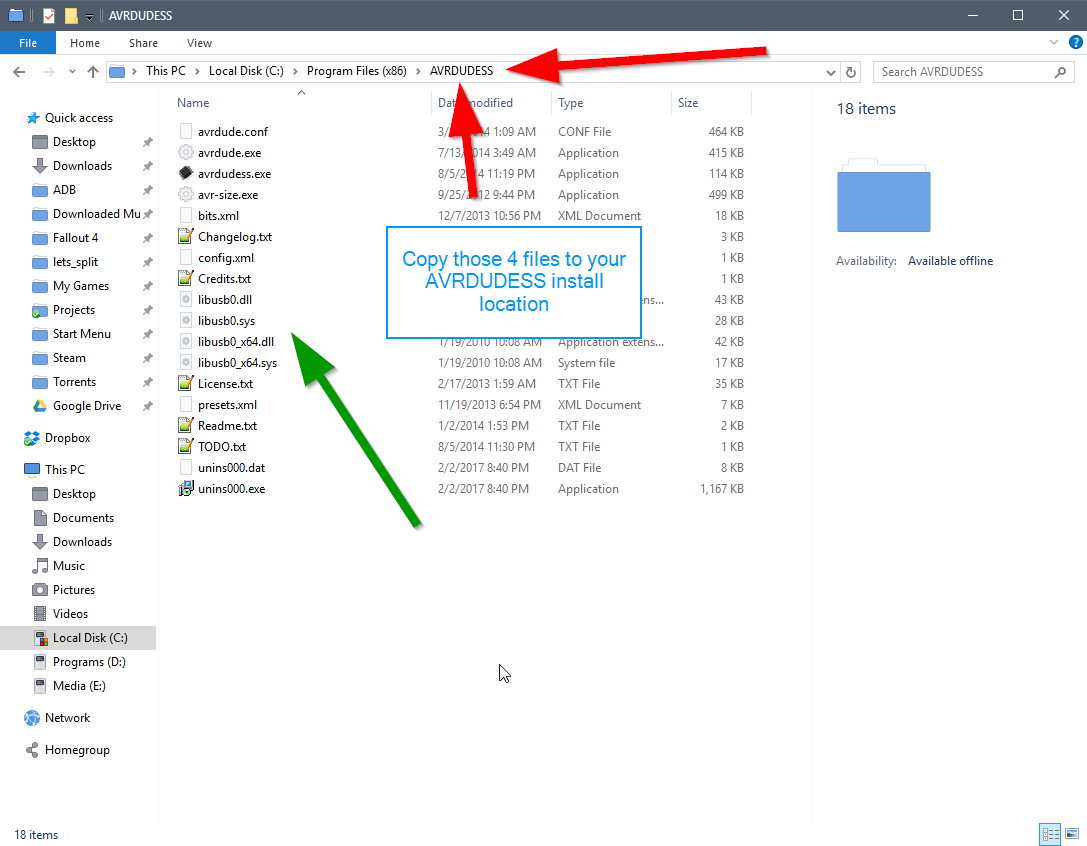 libusb0files from the WinAVR folder into the AVRDUDESS Program Files location and it should look like this now