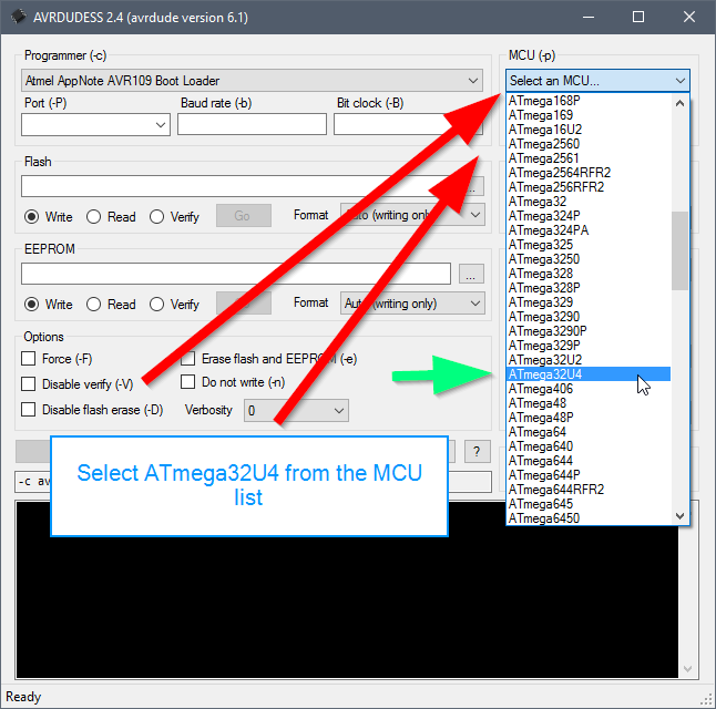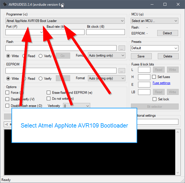 - Select Atmel AppNote AVR109 Boot Loader for the programmer