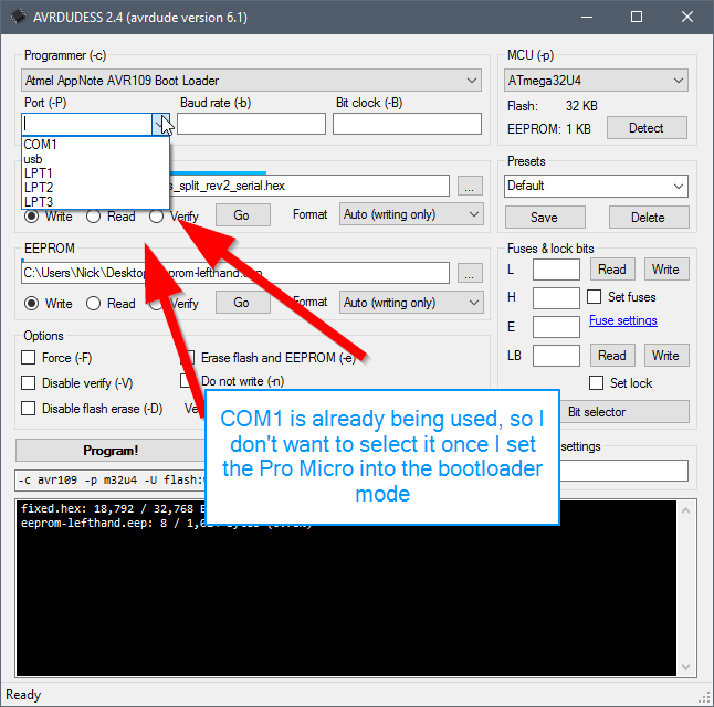 Quickly open the Port drop down menu and select the new COMM port that has popped up, then click program