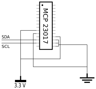 We'll start by connecting the chip. Connect pins 9 and 18 to 3v3, and pin 10 to ground. For now, connect pins 15 through 17 to ground as well. (They configure the I2C address of the chip, which I'll talk about later.) Now to be able to talk to the chip, connect pin 12 to the Pi's pin 5 (SCL) and pin 13 to the Pi's pin 3 (SDA). Here's my first ever attempt at a circuit diagram showing it, although I haven't included the Pi: