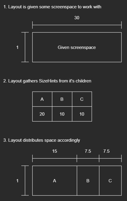 Assume we have a layout L. It has three widgets A, B, C and L's job is to place these widgets next to each other horizontally in a given screenspace, dividing the space equally. Lets assume L is given a screenspace of dimensions 1x30 units.