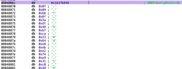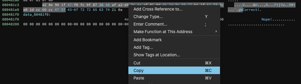 Back in Binary Ninja, I hit g for “goto”, and paste in 0x80481c3. This takes us to our expected encrypted data