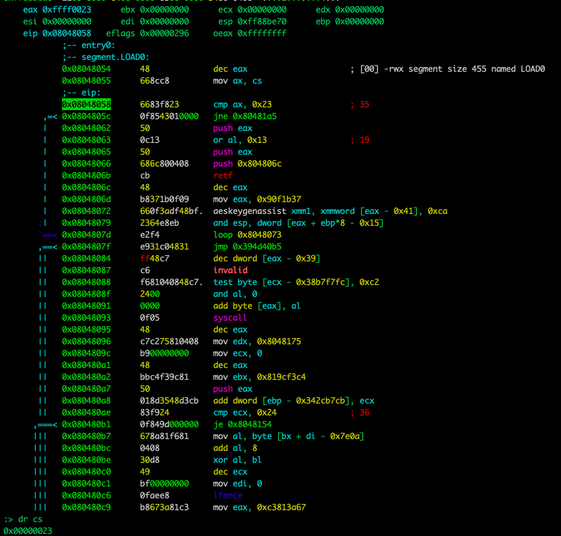 0x804805c jne 0x80481a5 <0x80481a5>So here’s our entry point. The real question we need to ask is what’s up with that cs register, and why is it examining whether it’s a 0x23? We already know if it’s not 0x23 it’ll jump to our Nope! code and fail out.
