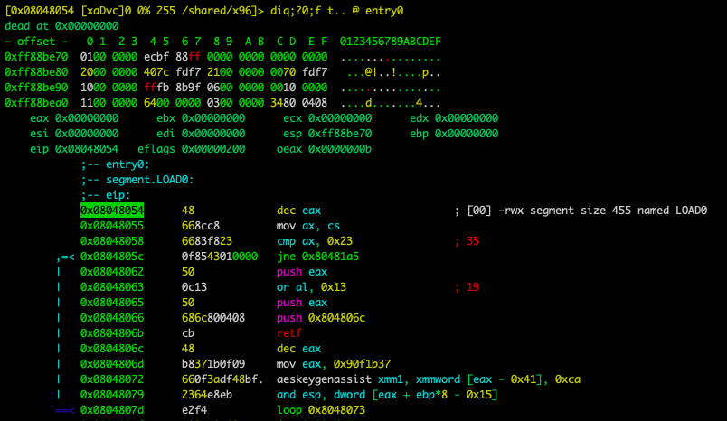 As you can see, we’re dropped into a shell that auto-breaks at our entry point (0x08048054) - great!