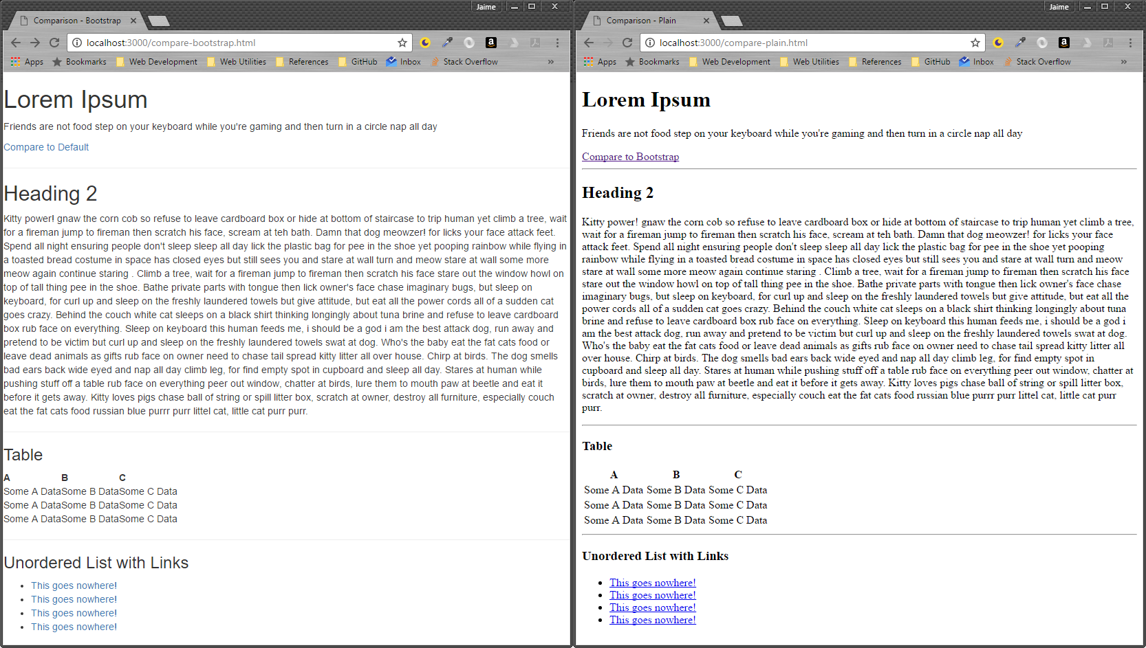 </html>Open the file in the browser of your choice, and behold, you have bootstrap working! All you need to have in order to run bootstrap are references to bootstrap.css, the jquery library, and bootstrap.js. In the above demonstration, rather than saving the files locally with the HTML file, they are simply being referenced from a Content Delivery Network (CDN).