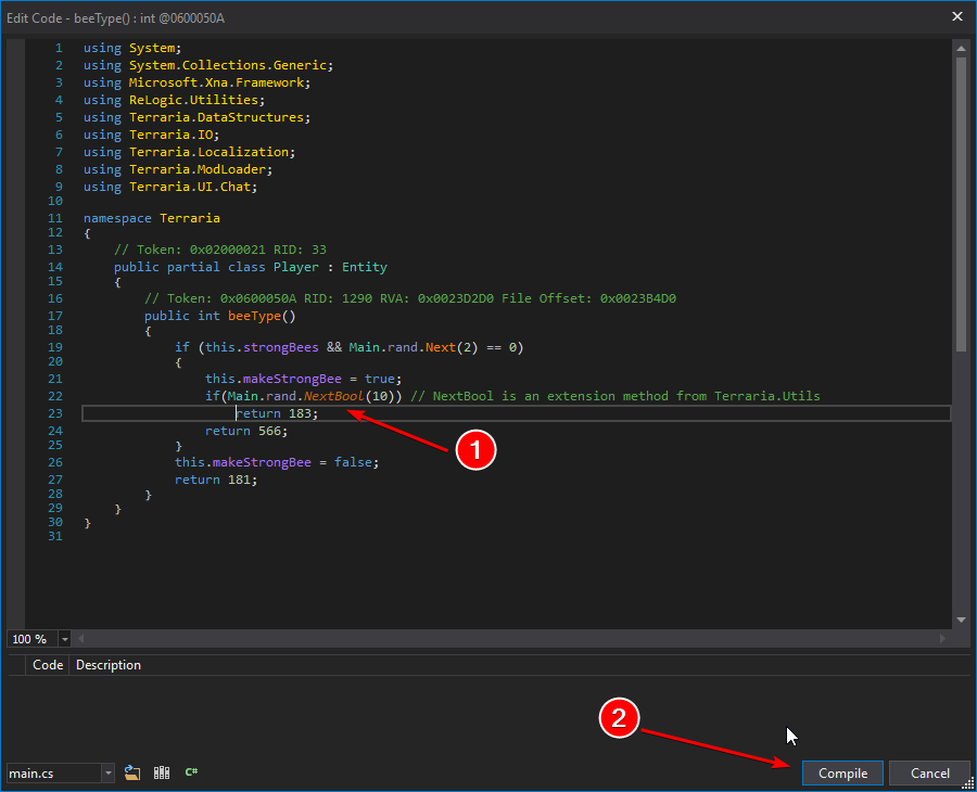 }This is the C# code for this method. If you look in Terraria.ID.ProjectileID, you'll see that 566 is GiantBee and 181 is Bee. Our plan is to change the chosen projectile to Beenade (183) with random chance. This is how the code we want would look: