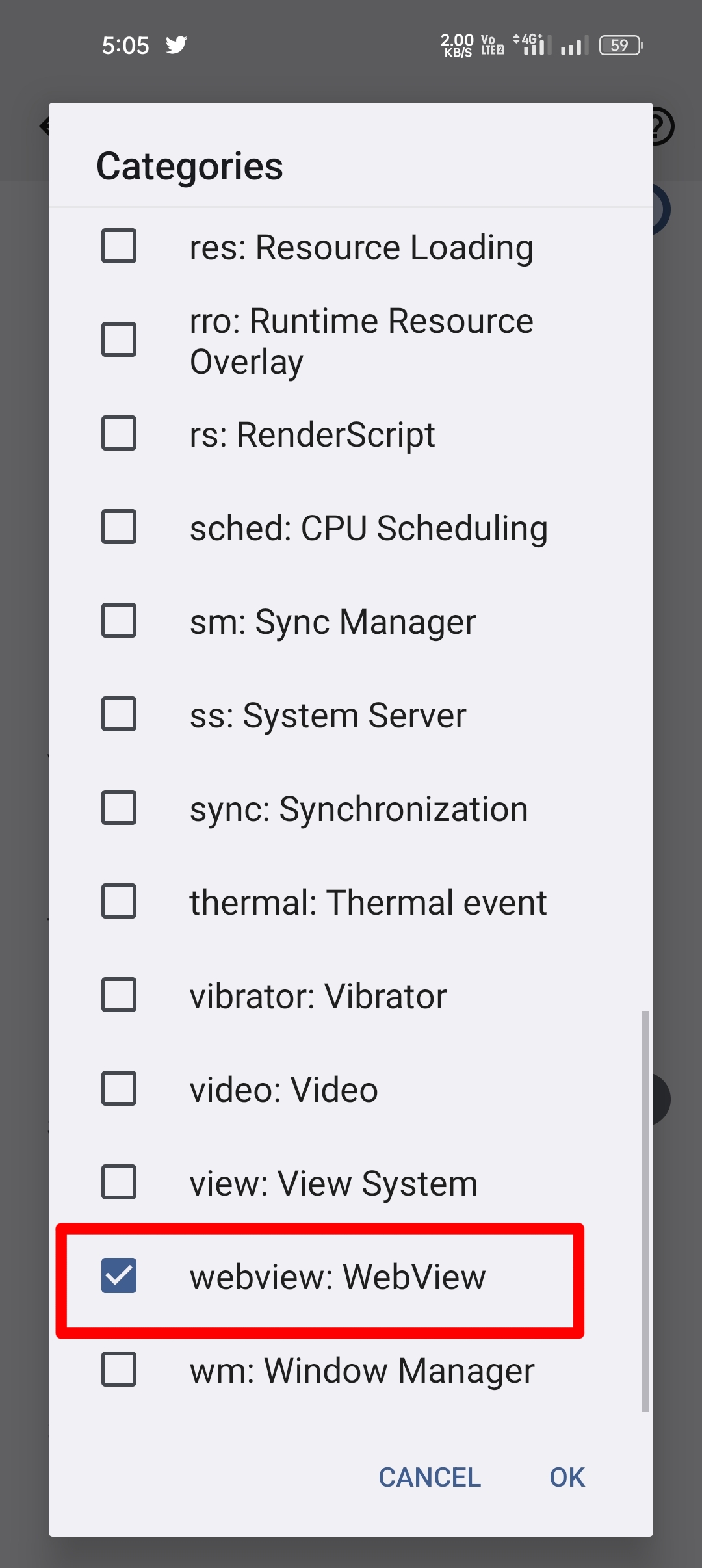- Try check category settings and only check list WebView