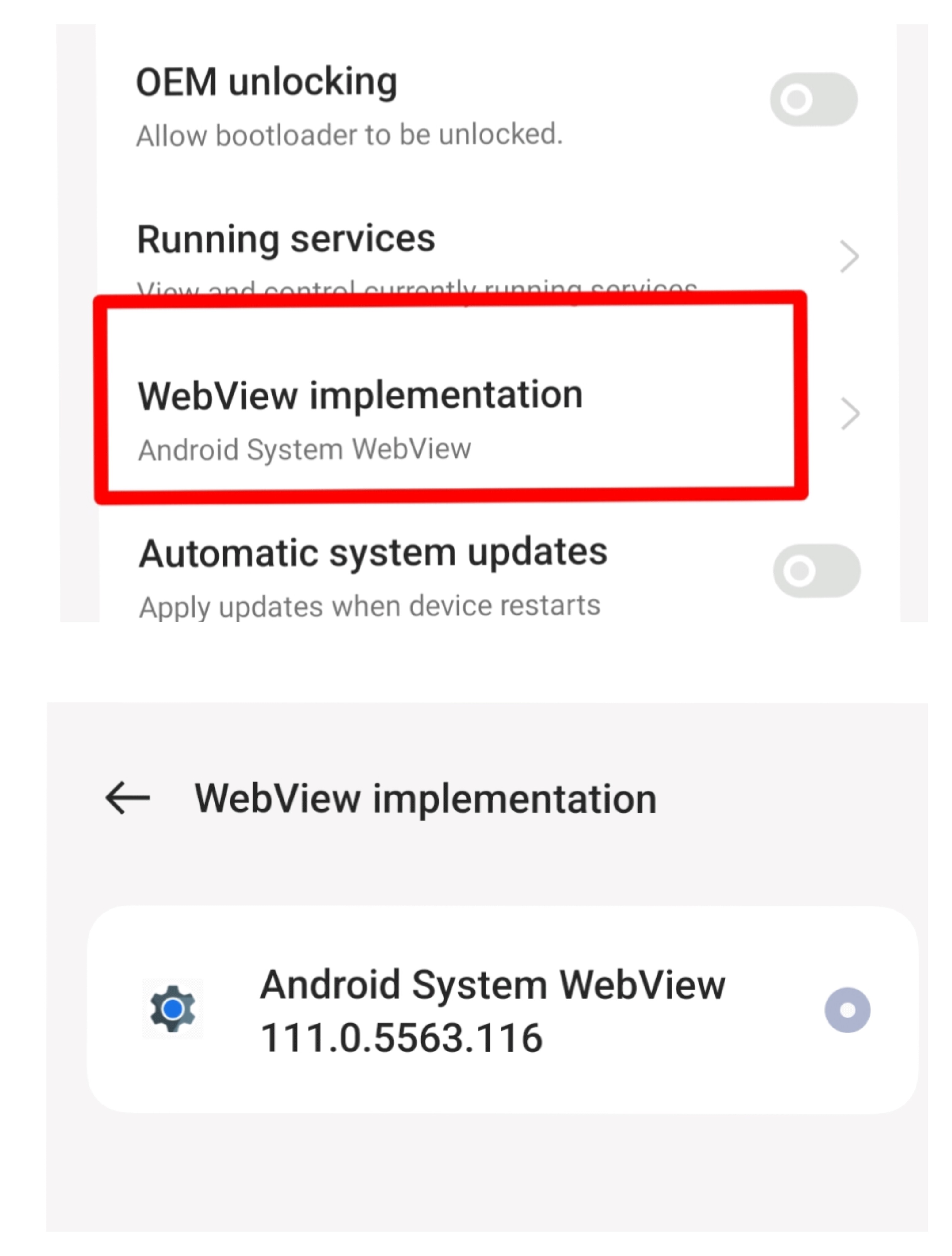 - You can check version Appwebview on developer options and tap Webview Implementation, If after you uninstall and Android system webview version still higher than version 113, it's mean your phone not compatible