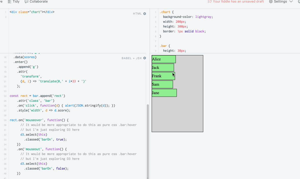 The bars will change colors when you mouse over and clicking on the bars will show the associated data element in an alert box.