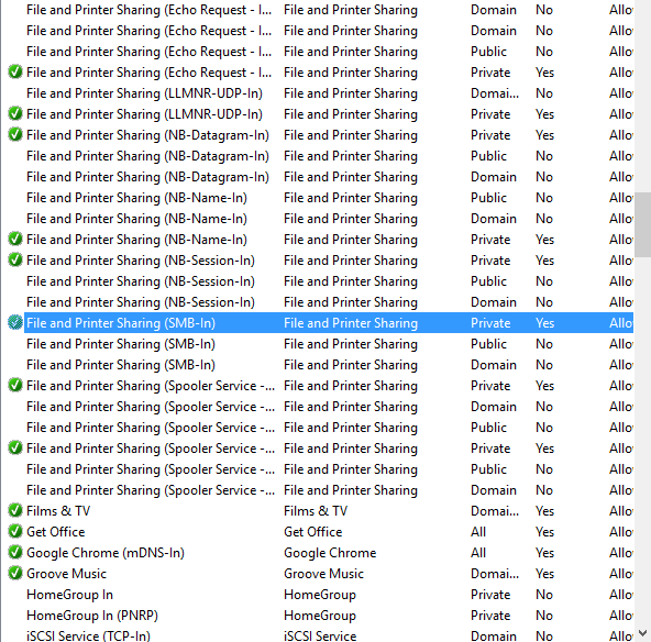 Nameby clicking the column and locateFile and Printer Sharing (SMB-In)with theProfilePrivate
