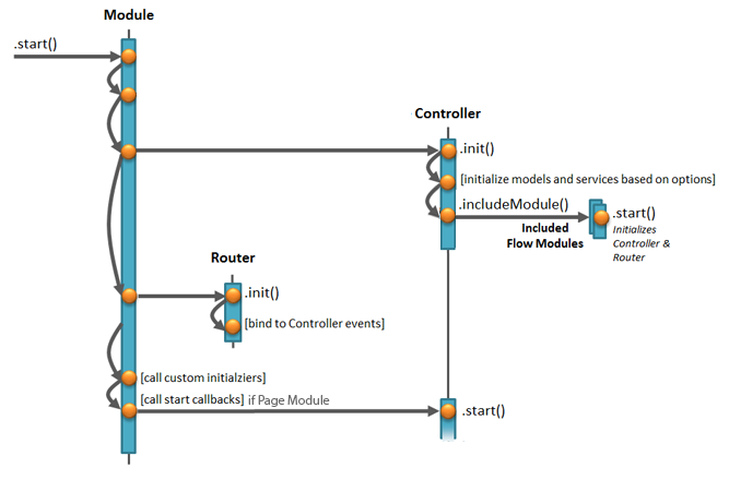 When we include a Flow Module with the includeModule method, the Controller starts that Module, and returns a reference of its Controller instance. After this, we can call its methods directly when needed (e.g. start, actions) and bind to events it triggers: