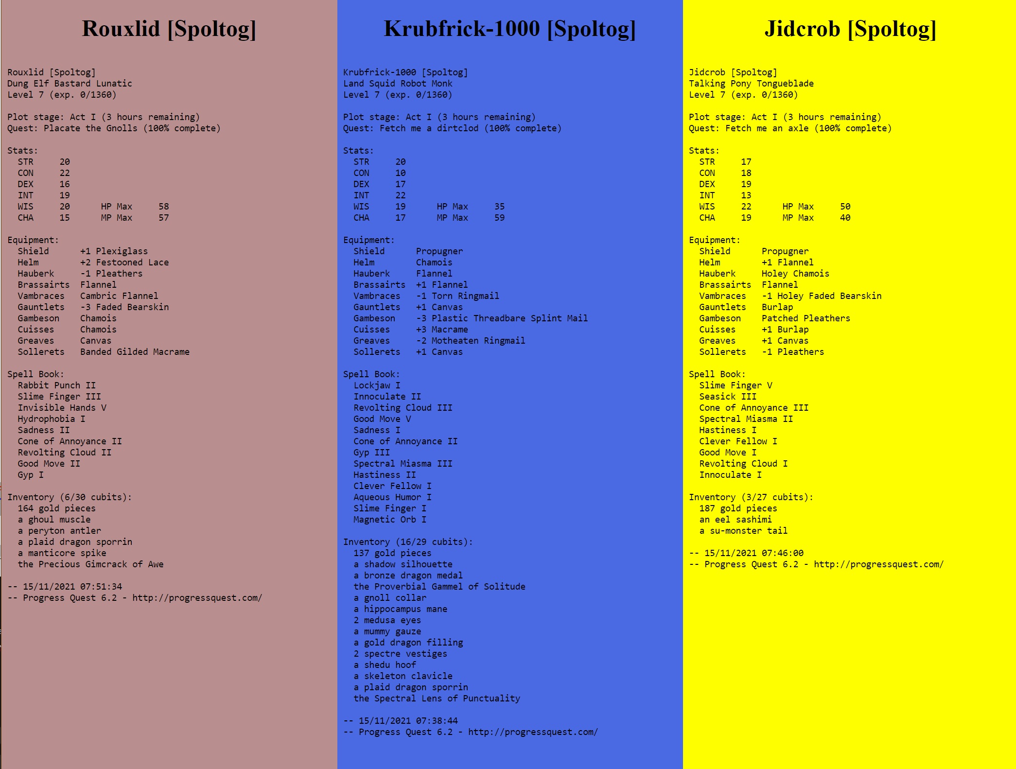 This is a basic HTML page which displays 3 Progress Quest character sheets. You can use the progress quest export functionality to export your character sheets periodicly and directly use them here, as long as the paths to the sheets are correct.