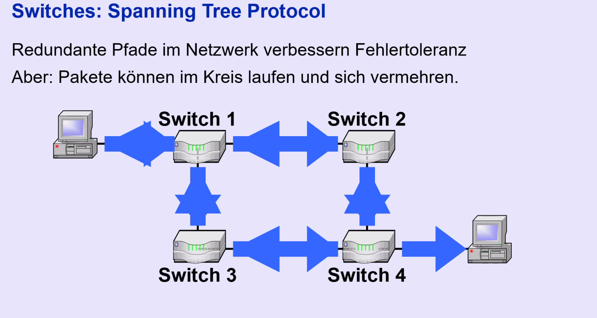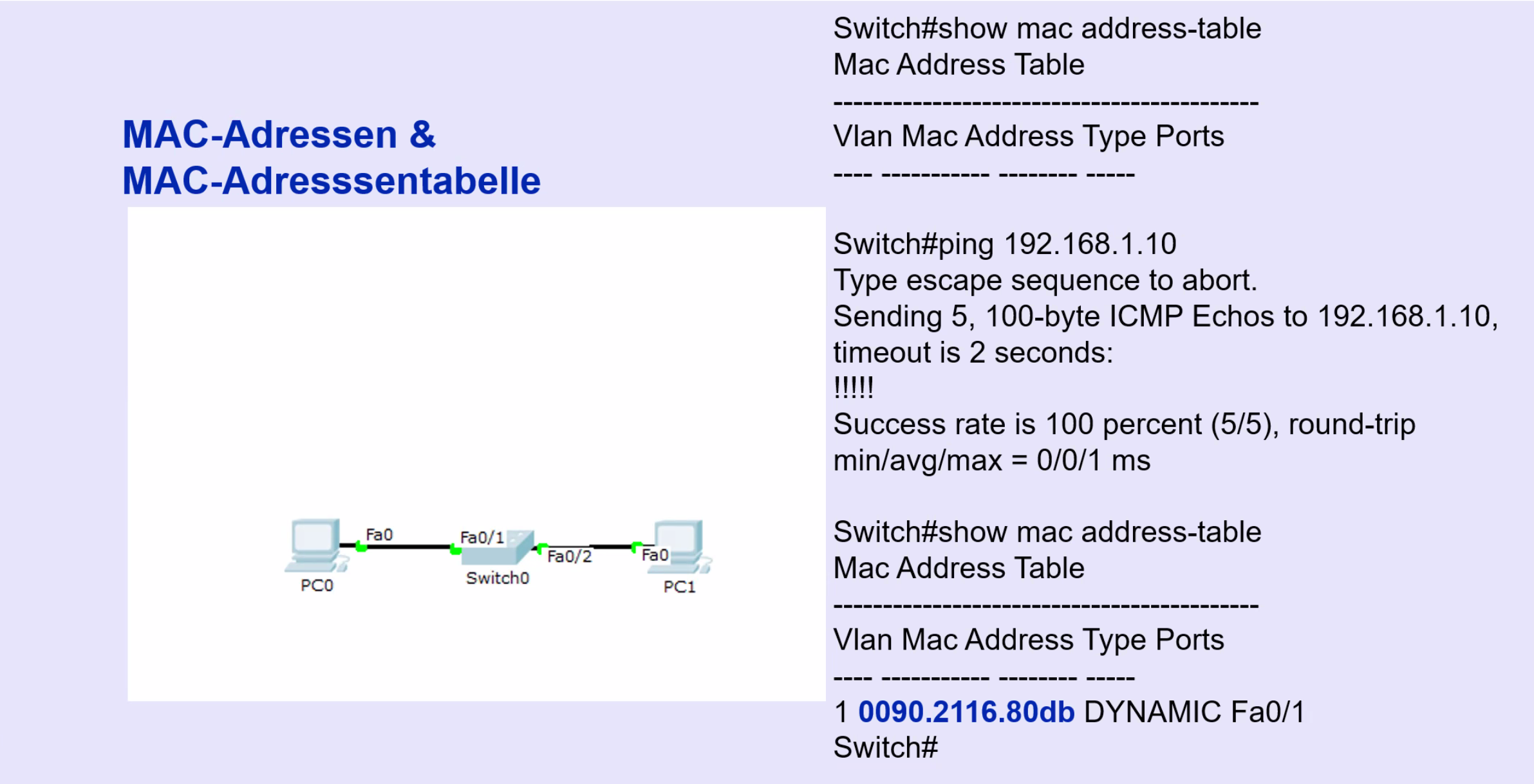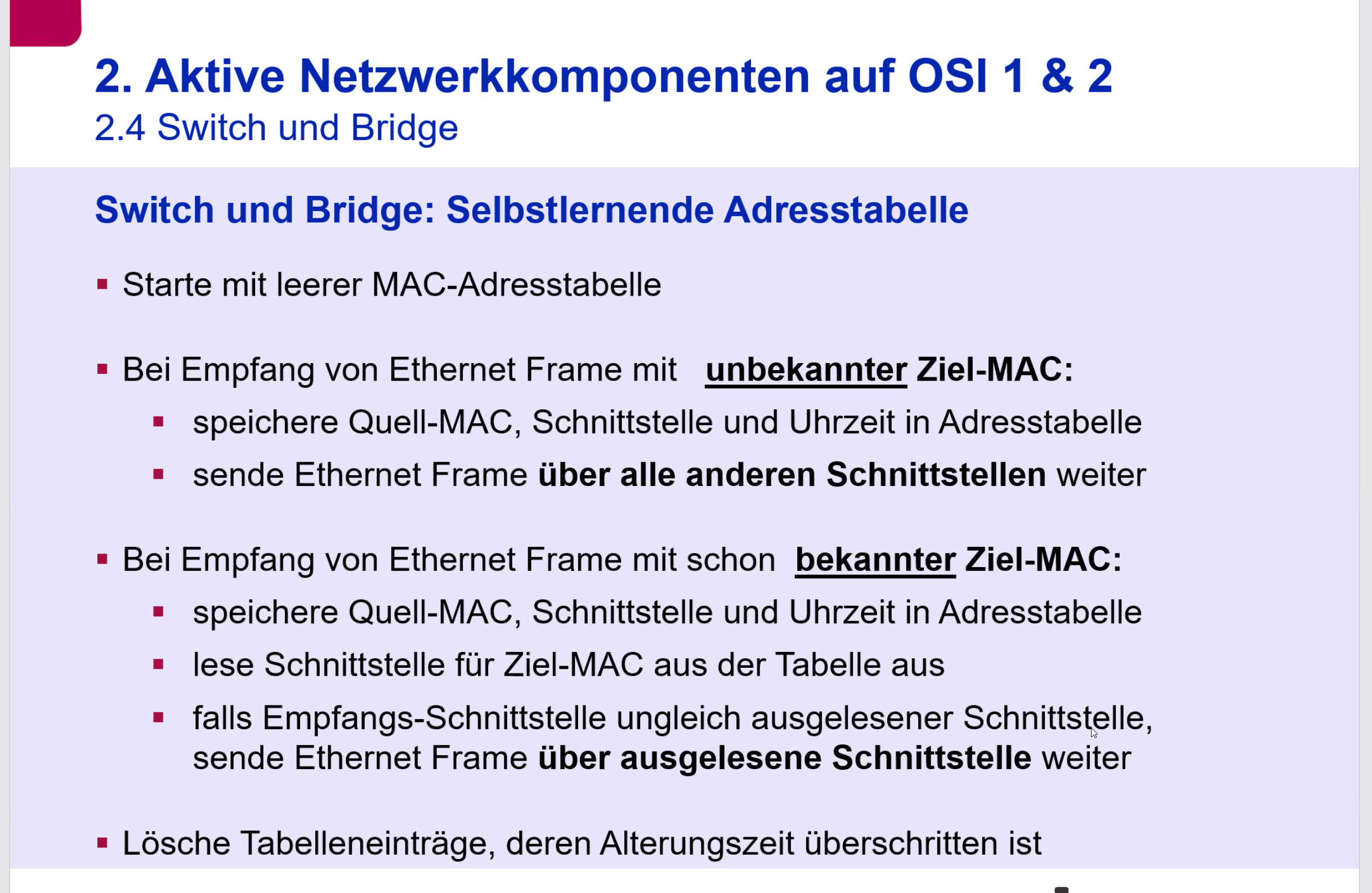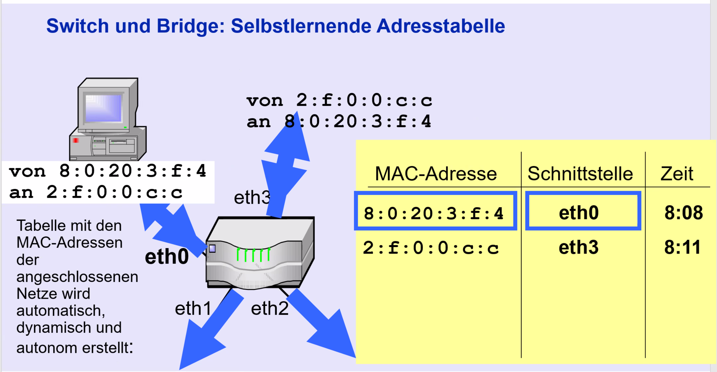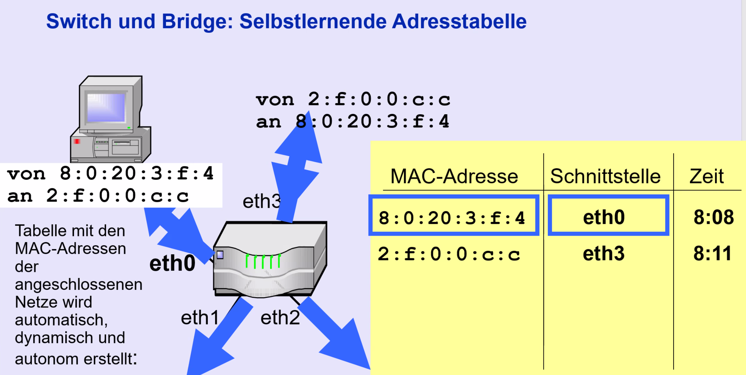 - Merkt sich bevorzugt Ports von Absender-MAC-Adressen -> PC1 an Port eth0 schickt ein Paket mit Absenderadresse 8:0:20:3:f:4