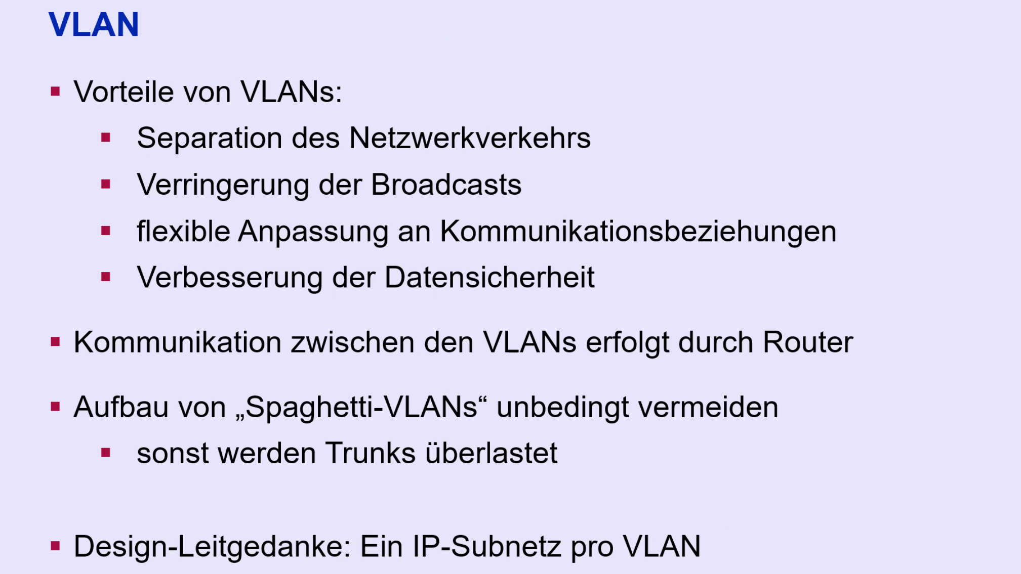 Kommunikation zwischen den VLANs erfolgt durch Router Aufbau der Spaghetti VLANs unbedingt vermeiden