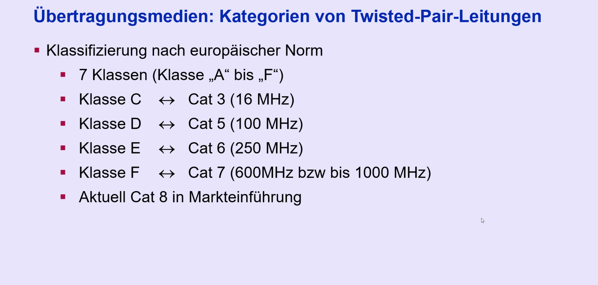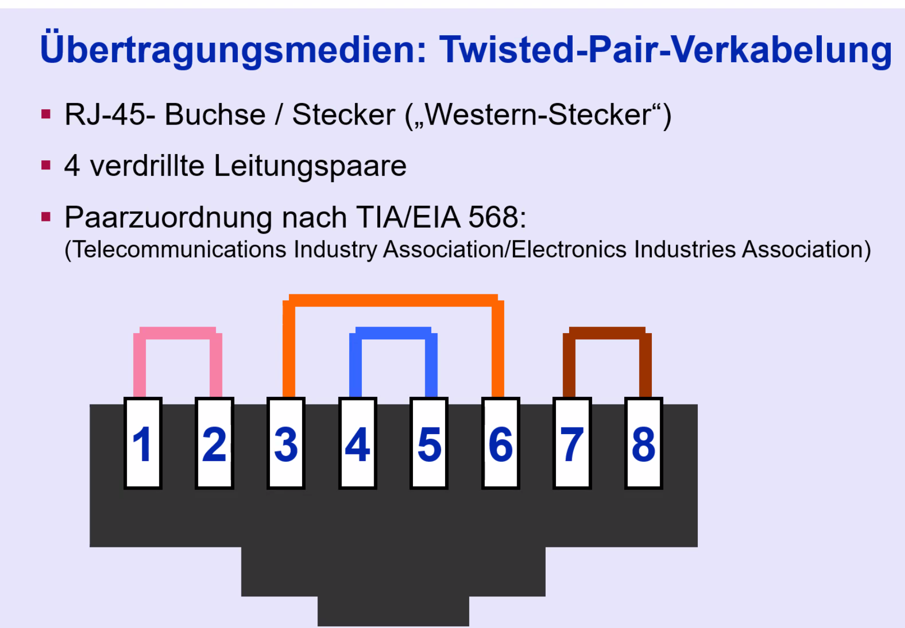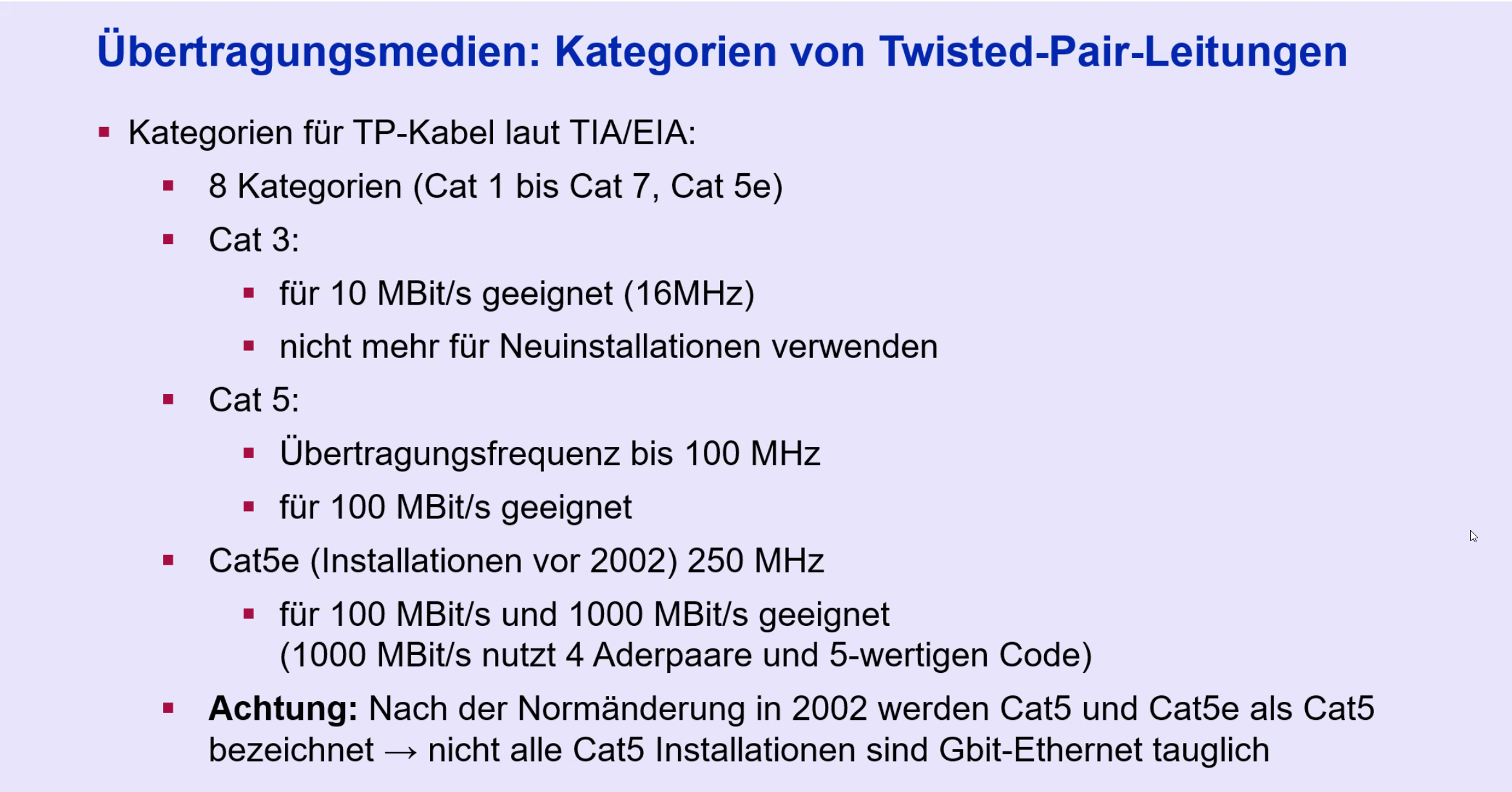 - Twisted Pair: verdrehte Leitungen sind stabiler als einfache