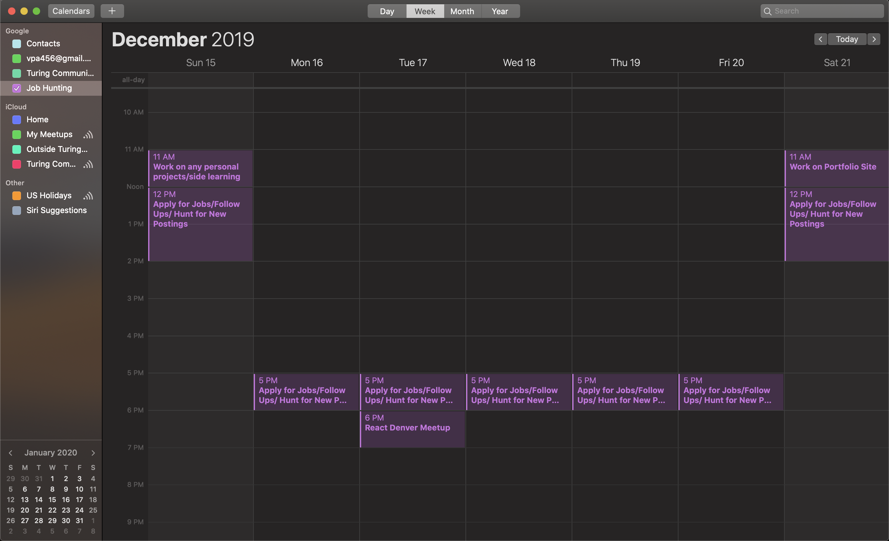 What is a realistic way to spend your time? (Don't overcommit yourself; consider blocking out 1 hour a day or a few times a week) I believe I covered this question mostly up above but maybe to elaborate, I would like to do some of my heaviest hunting on the weekends and give myself an hour, or maybe a little more, during week days. This will allow me to tee up work throughout the week and then do my heaviest focused activities such as cover-letter writing for my days where I don’t have to commute or worry about class.