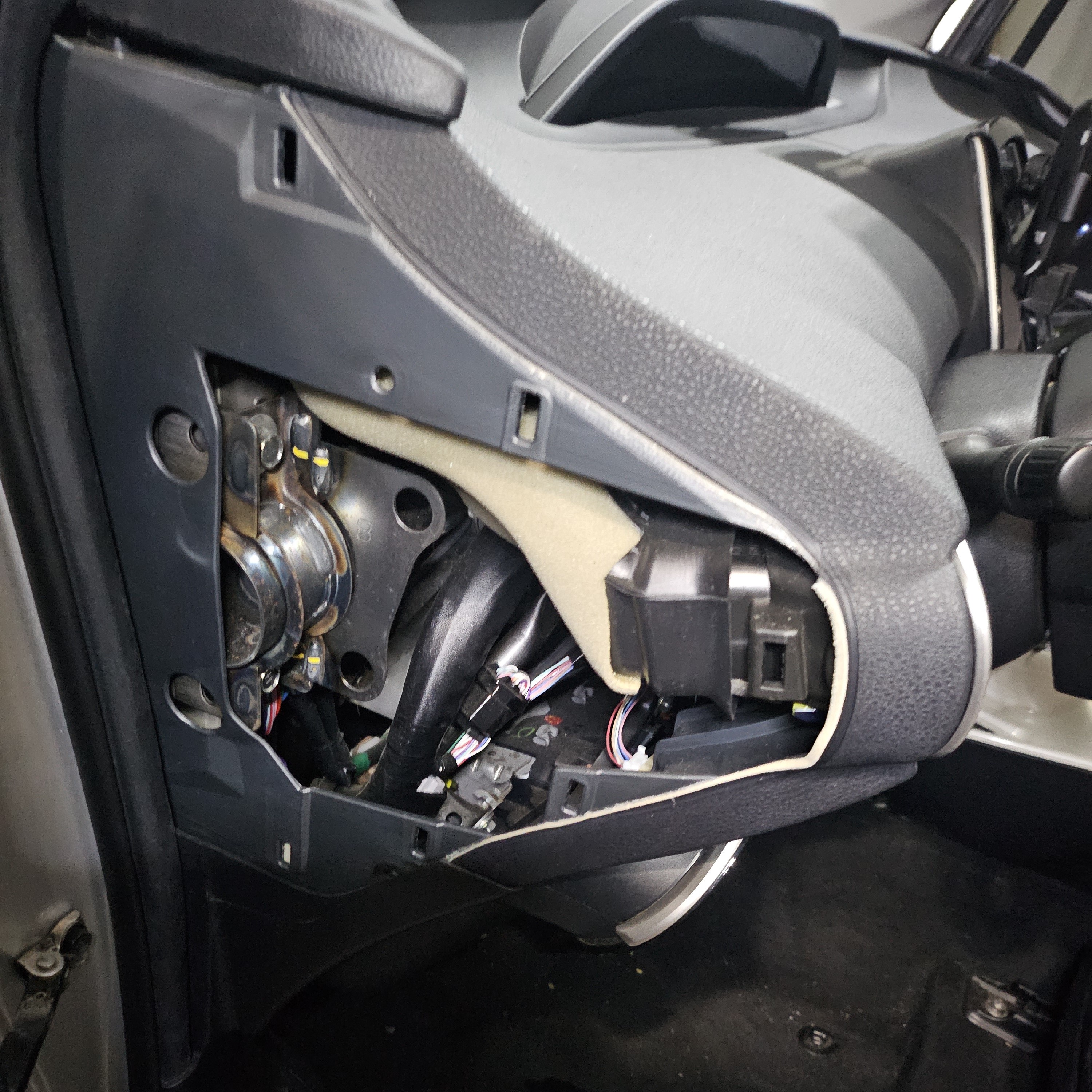 The next steps will be in preparation for dropping the steering column to access the EPS motor. Rotate the steering wheel (will be tight due to no power) until a Phillips screw is visible on the right or left. Unscrew this and do the same for the other side.