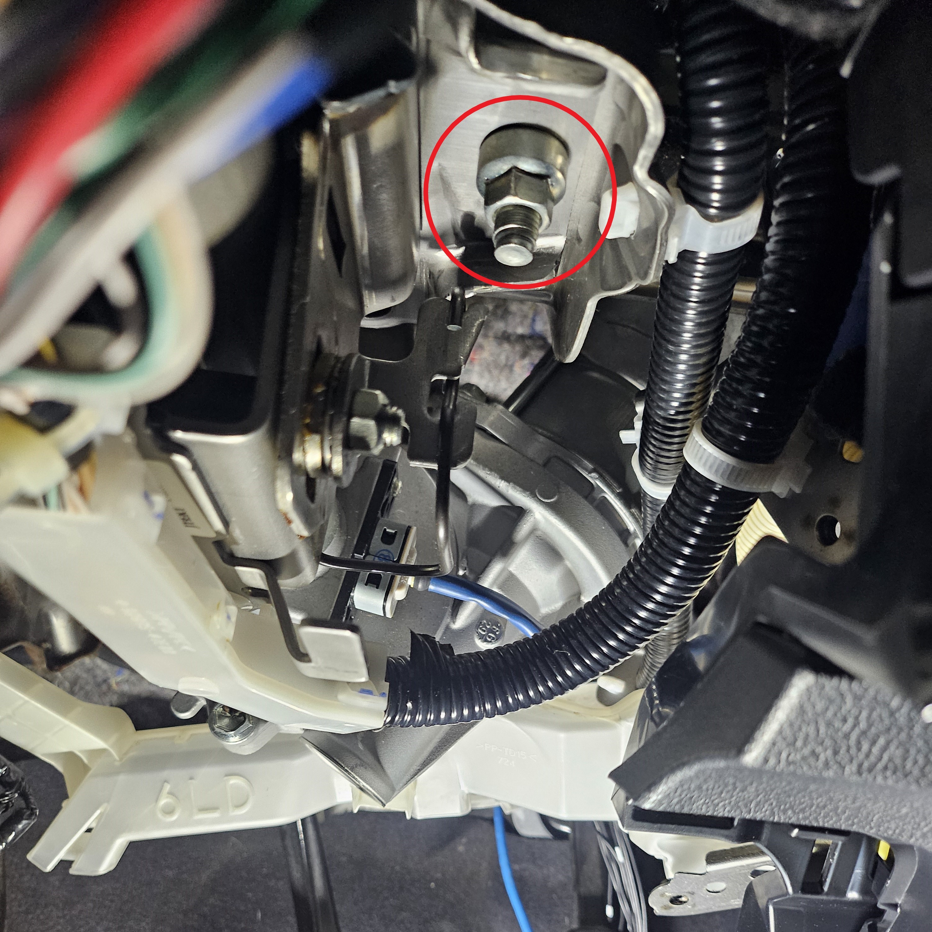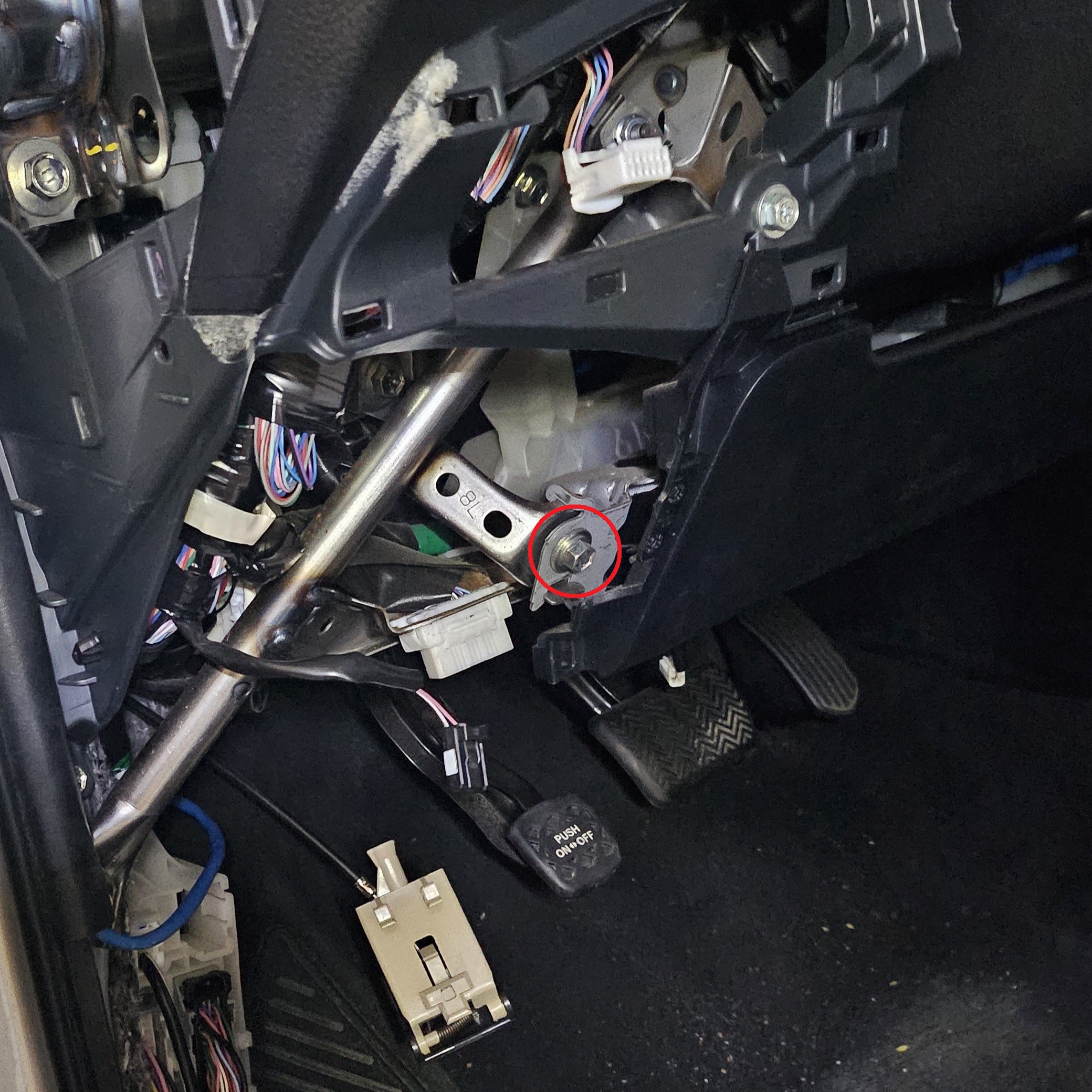 The steering column pivot bolt acts like a hinge towards the lower part of the column. In order to access it, the brake pedal light switch towards the left may need to be removed.
