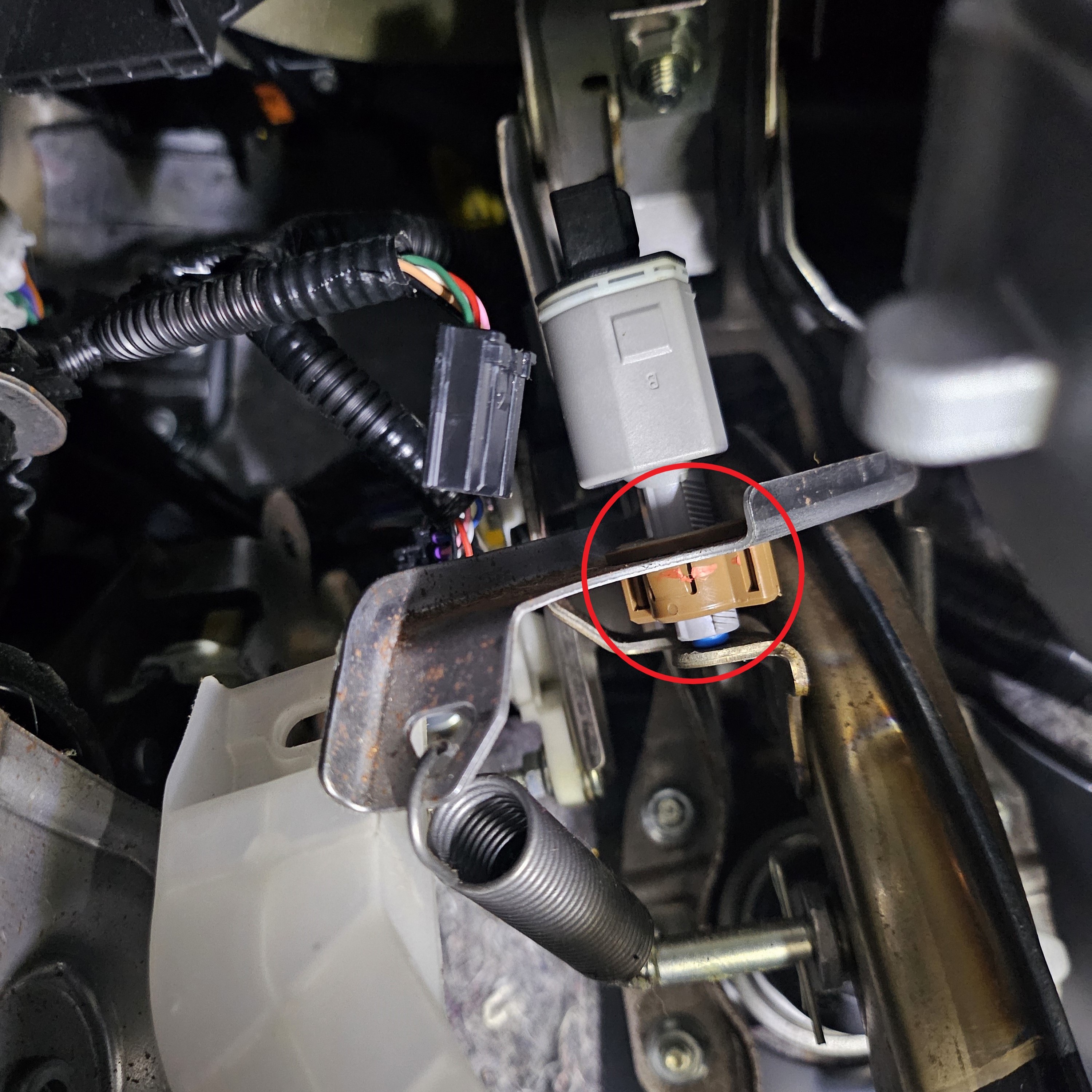 Remove this gray switch by simply disconnecting the black connector and twisting the switch in place. Make sure to note how much the blue button is displaced when reinstalling.