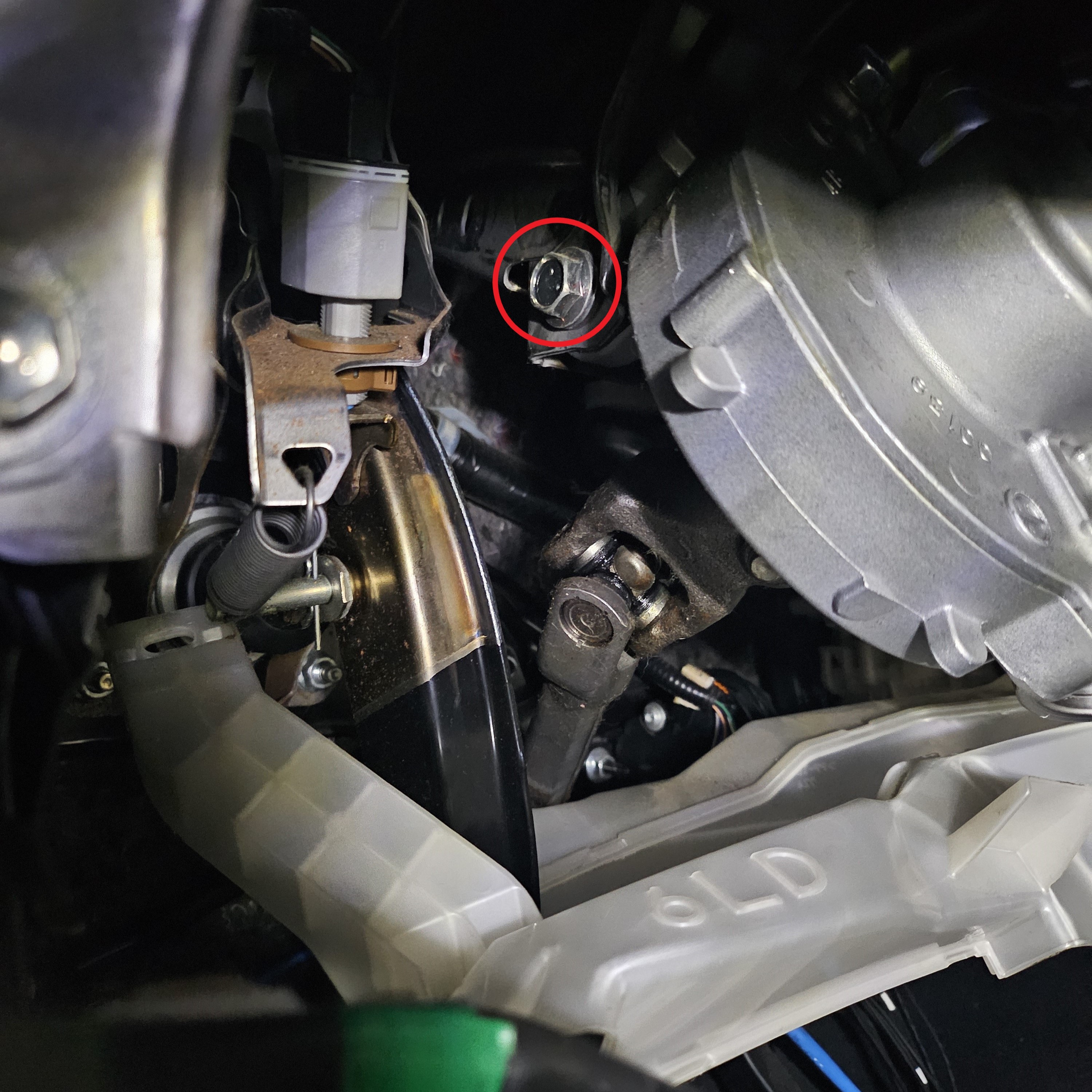 Carefully drop down the column while it is supported and locate the old EPS motor. Rotating and moving the column could help to get better access to the motor. Remove the two 12mm bolts and unclip the three black connectors.
