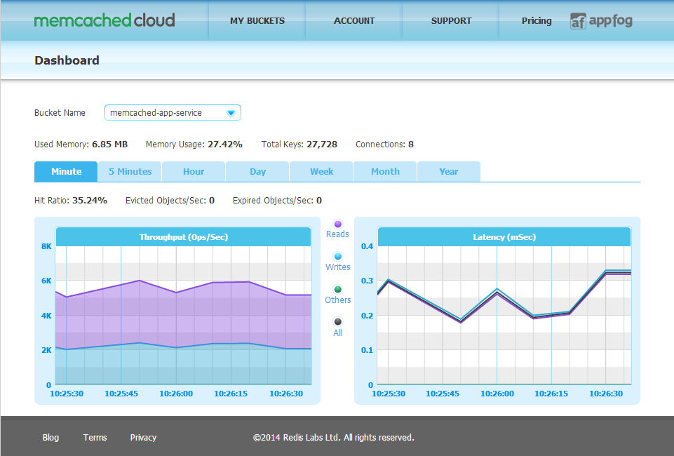 Memcached Cloud is a fully-managed service that operates your Memcached in a reliable and fail-safe manner. Your dataset is constantly replicated, so if a node fails, an automatic failover mechanism guarantees that your data is served without interruption. Memcached Cloud provides various data persistence options as well as remote backups for disaster recovery purposes. You can quickly and easily get your apps up and running with Memcached Cloud through its add-on for AppFog, just tell us how much memory you need and start using your Memcached bucket instantly.