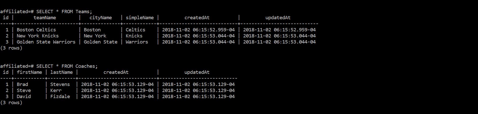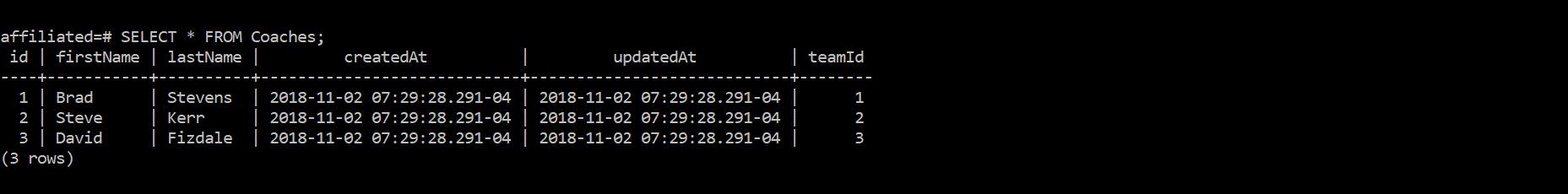 Coach.belongsTo(Team); // A one-to-one relationship that adds the column titled "teamId" to the table of coaches;After adding those two lines of code, and running the seed script, our table of coaches now appears like so:
