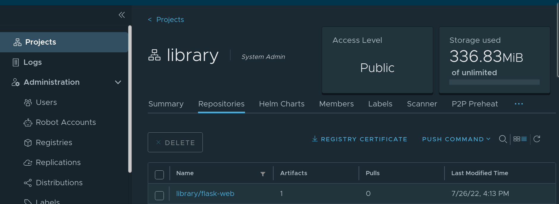 Login harbor portal and check project library