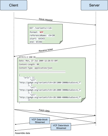 Response body (also called the JSON ticket) contains a set of URLs for retrieving data-blocks in VCF format. The URLs returned by this first GET call is "self-explanatory". For example: <domain>/variants?chr=20:1000-2000&studies=6,7. This URL works without having to store any Hash-like structure internally.
