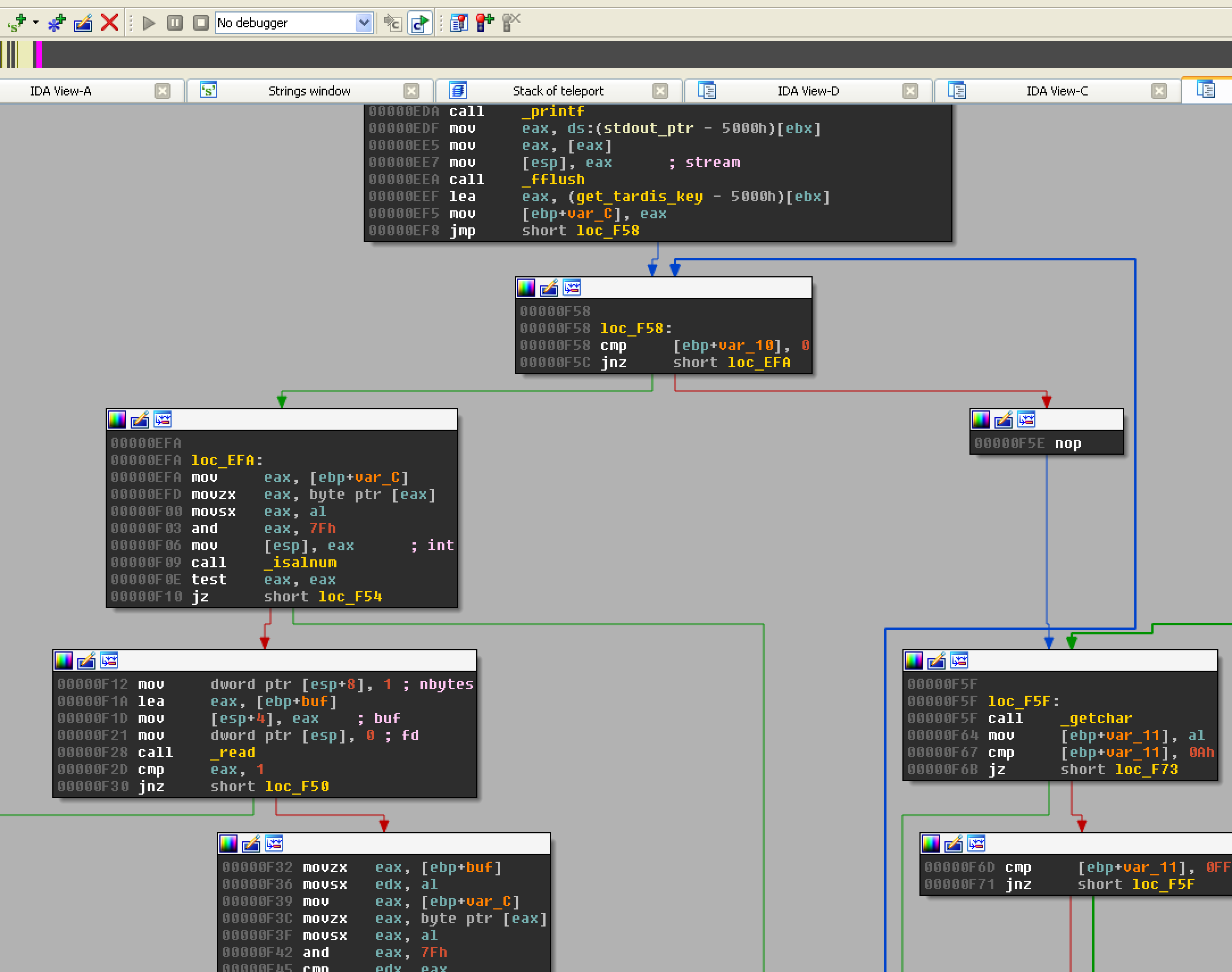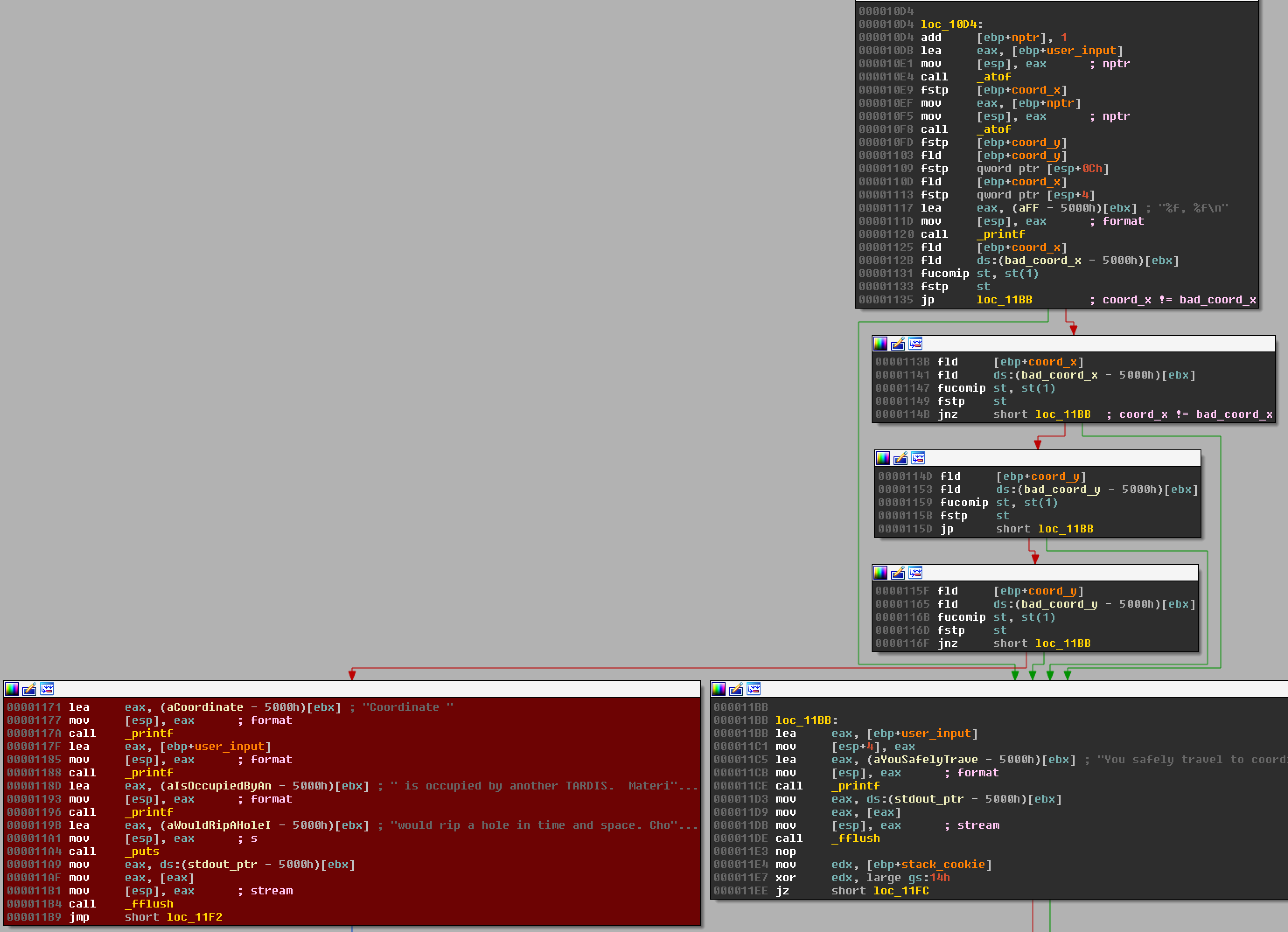 Luckily for me, I have a @MarvelousBreadchris on my team, so I didn't have to write the game solver. As soon as you solve the game and get to the "tardis" though, you get a password prompt. Getting it wrong causes the game to exit. Here's where it gets a bit tricky: if you use a debugger and step through the password function one instruction at a time, you might find that you end up with the wrong password.