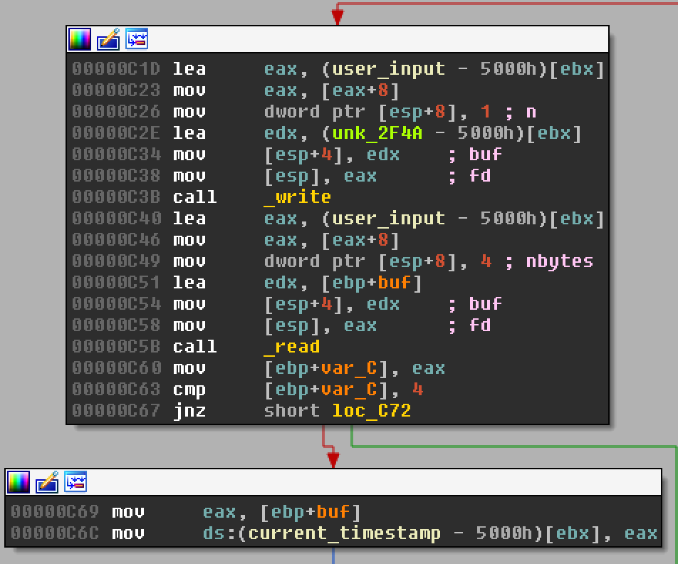 We can see it's using user_input[2] as the file descriptor for read. For the sake of "brevity", user_input[2] actually holds the file descriptor for a loopback socket, which we don't have access to as an outside attacker. This is unfortunate, because in the second block of the last screenshot, we see that the input on this socket is directly written into current_timestamp - what the "tardis" uses to confirm the current time.