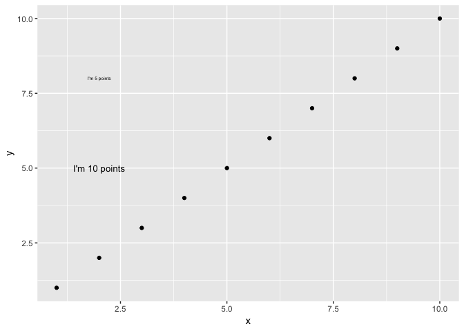 annotate(geom = "text", x = 2, y = 5, label = "I'm 10 points",
