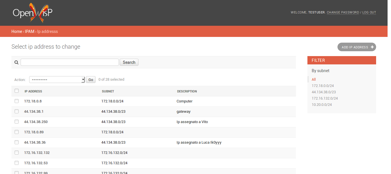 The user can search for any IP address under any selected subnet. This was an easy to implement feature, thanks to Django admin framework. The user can also filter for IP addresses with respect to any subnet.