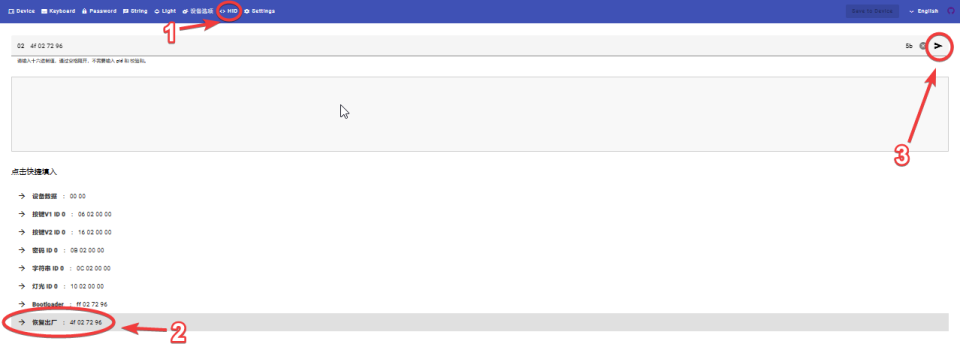 HID tab, select the option at the very bottom (that's the factory reset code), then click on the arrow to send it to the device. -