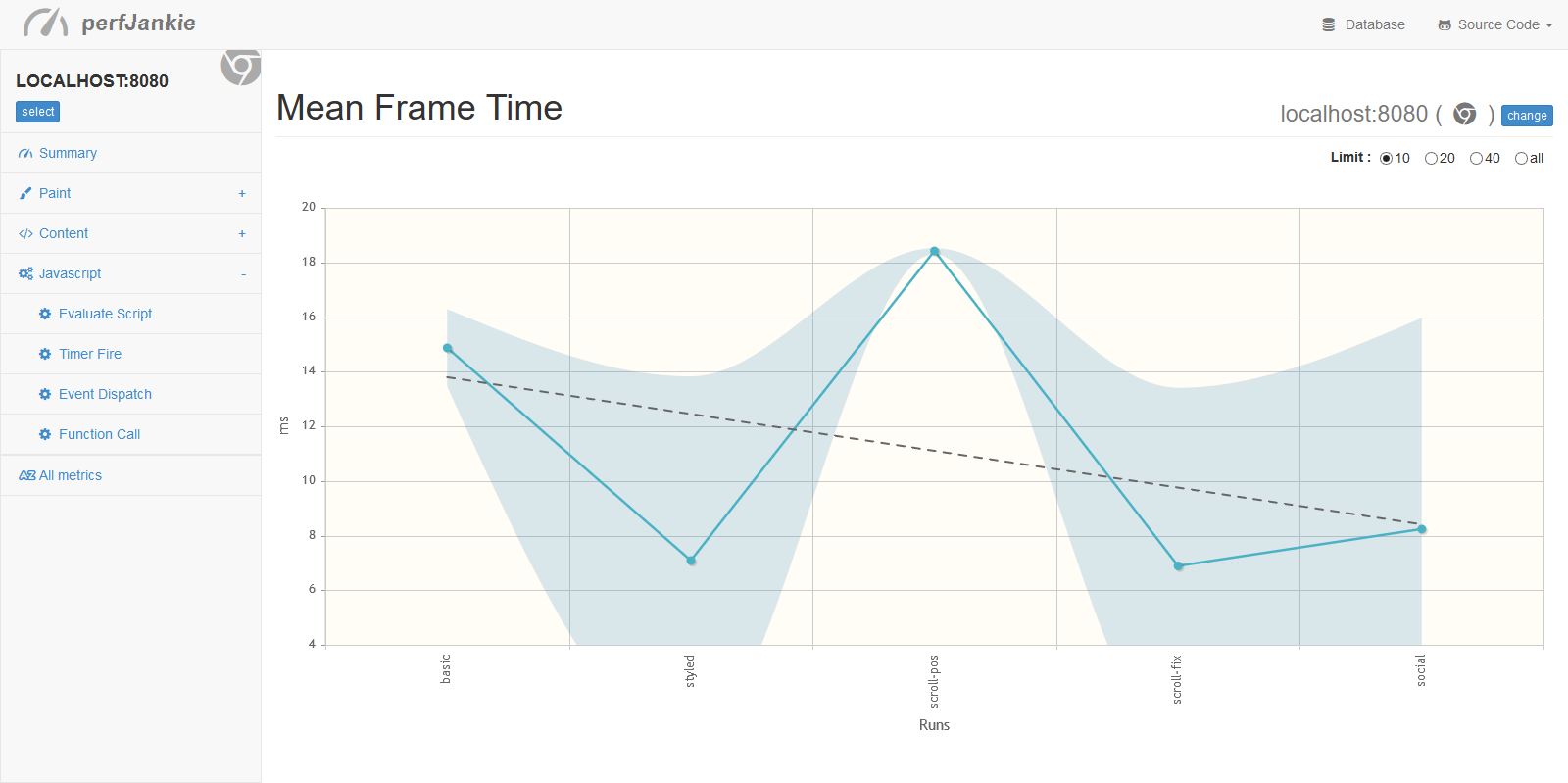 perfjankie is an open source tool that automates this rendering performance workflow. It picks up performance data from browser developer tools and converts them to metrics like frame rates, expensive event handlers, paints, layouts, etc. It runs tests on real browsers, mimicking typical user interactions like clicking buttons, scrolling a page or typing in content and stores the results in a CouchDB database. It also has a dashboard with graphs that help you analyze performance trends or locate a single commit that slowed down the site.