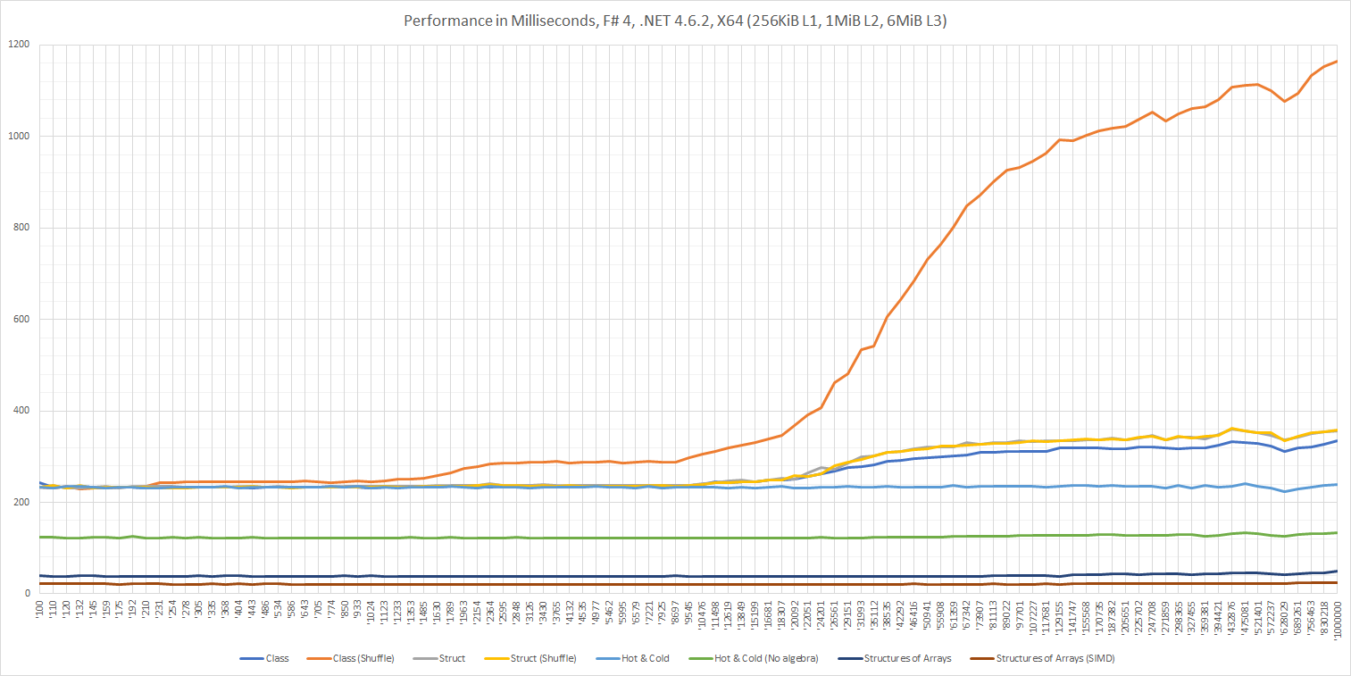 In .NET 4.6 we got SIMD enabled data structures like System.Numerics.Vector3. This should give a performance improvement. An issue with .NET 4.6 SIMD is that System.Numerics.Vector3 only supports single precision floats. This divides the size of the test data by two so it's not a fair comparison. However, I thought it could be interesting to include anyway so I added test case Structures of Arrays (SIMD).