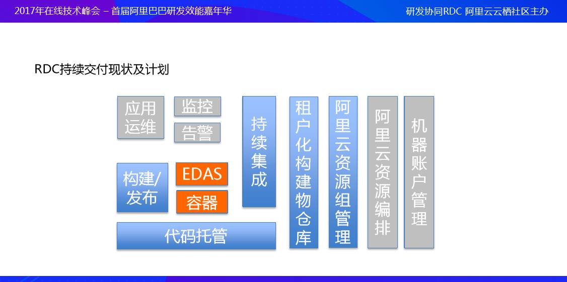 上图中,企业入驻RDC企业级研发协同平台后就可以享受整个阿里云的基础设施。EDAS也是阿里云正在做的事情,ECS、SLB等资源也可以通过RDC进行整合。