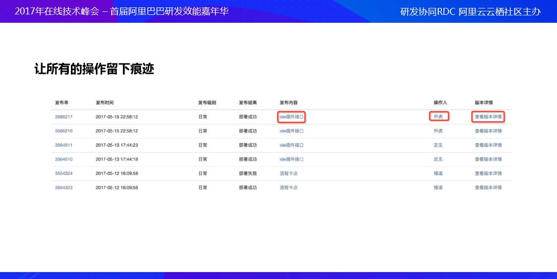 上图中的列表是一个发布的列表,包括发布内容、发布结果、操作人、版本详情等内容。所有信息都可以帮助追溯之前发生的事情,并且进行问题解决。