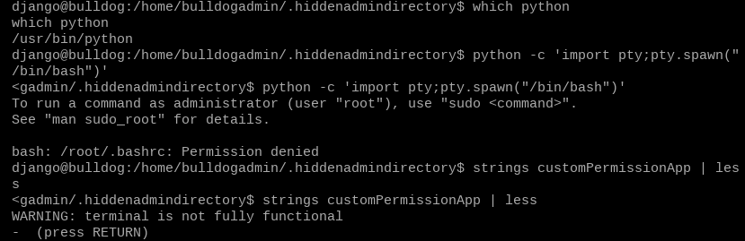 "sudo su" also requires a password, but the line "Usage: ./customPermissionApp " doesn’t appear to even ask for one. The note did mention that it only worked for the Django user, too. Could this mean that the password for the Django user is contained within this file?