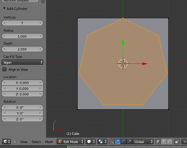 Open up the default file with a cube in the middle. Edit the cube using "Tab". From the top view ("7" on the num pad), add a cylinder ("Shift+A -> Cylinder"), and in the menu (which is on the left by default) there is an option for vertices, I chose 7 for having a nice low-poly mesh (an even number is less nice, you can test it by yourself).