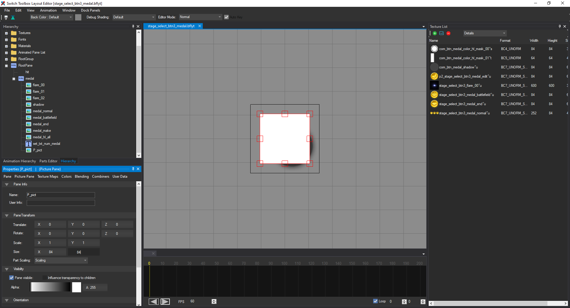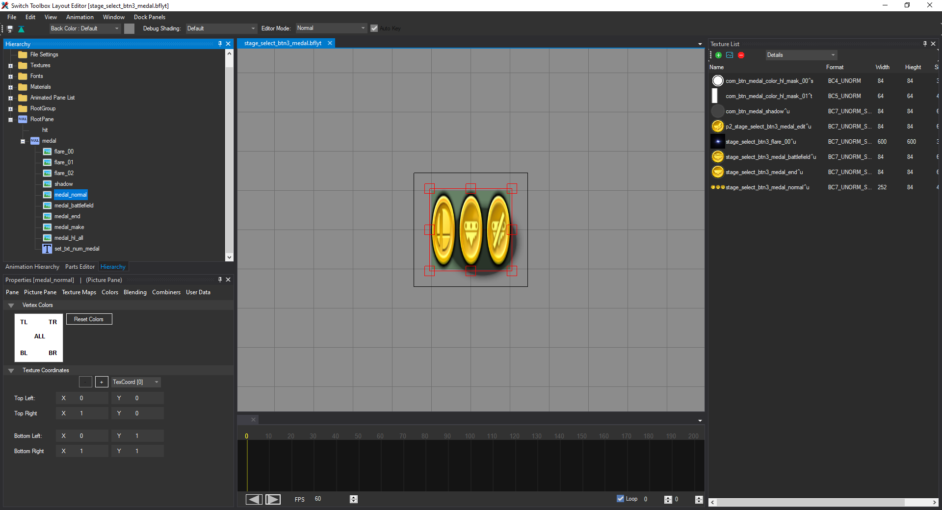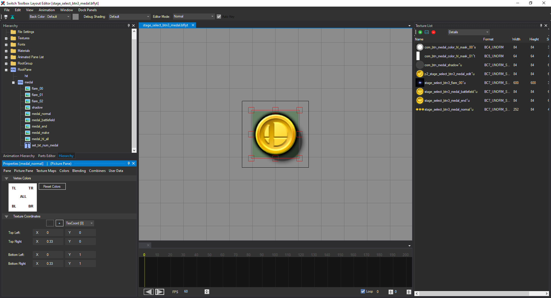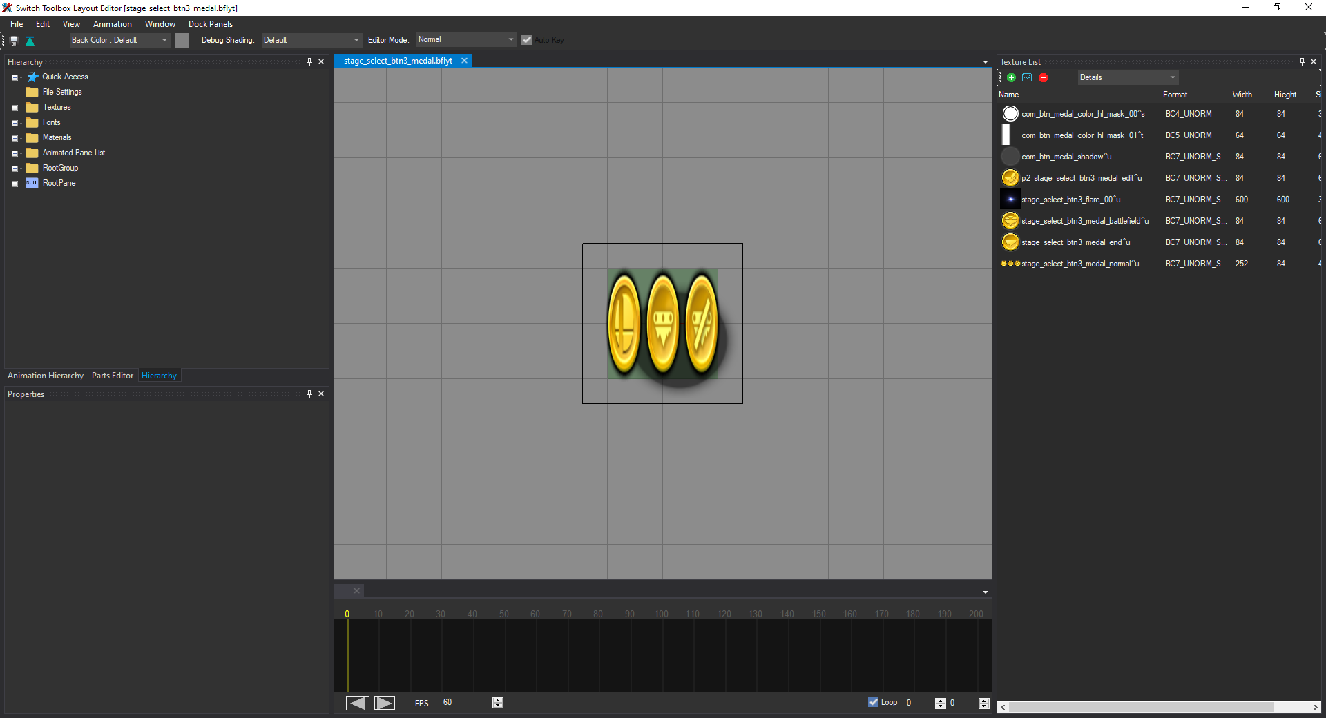 In order to fix this, we need to go to the Hierarchy tab on the left side of the window. It should display a list of expandable sections. We want to expand RootPane, then medal. You'll see a list of panes with names like flare_00, medal_normal, medal_battlefield, shadow, etc. (not in that order). Your window should now look like this: