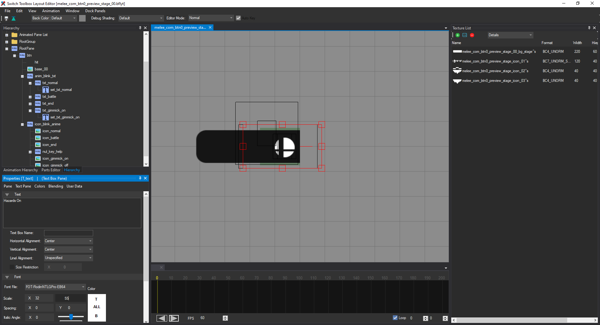 Open the file named melee_com_btn0_preview_stage_00.bflyt in the layout listing. Once it's opened in the layout editor, it should look like this: