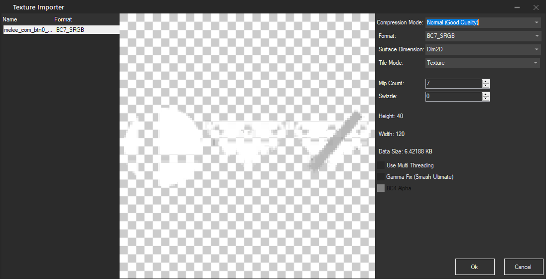 Right click on the regular smashball icon in the Texture List and replace it with preview.png. Change the format to BC7_SRGB, which is not the same as what we are replacing but it won't cause any problems. Make sure the quality is Normal (Good Quality) and then click ok: