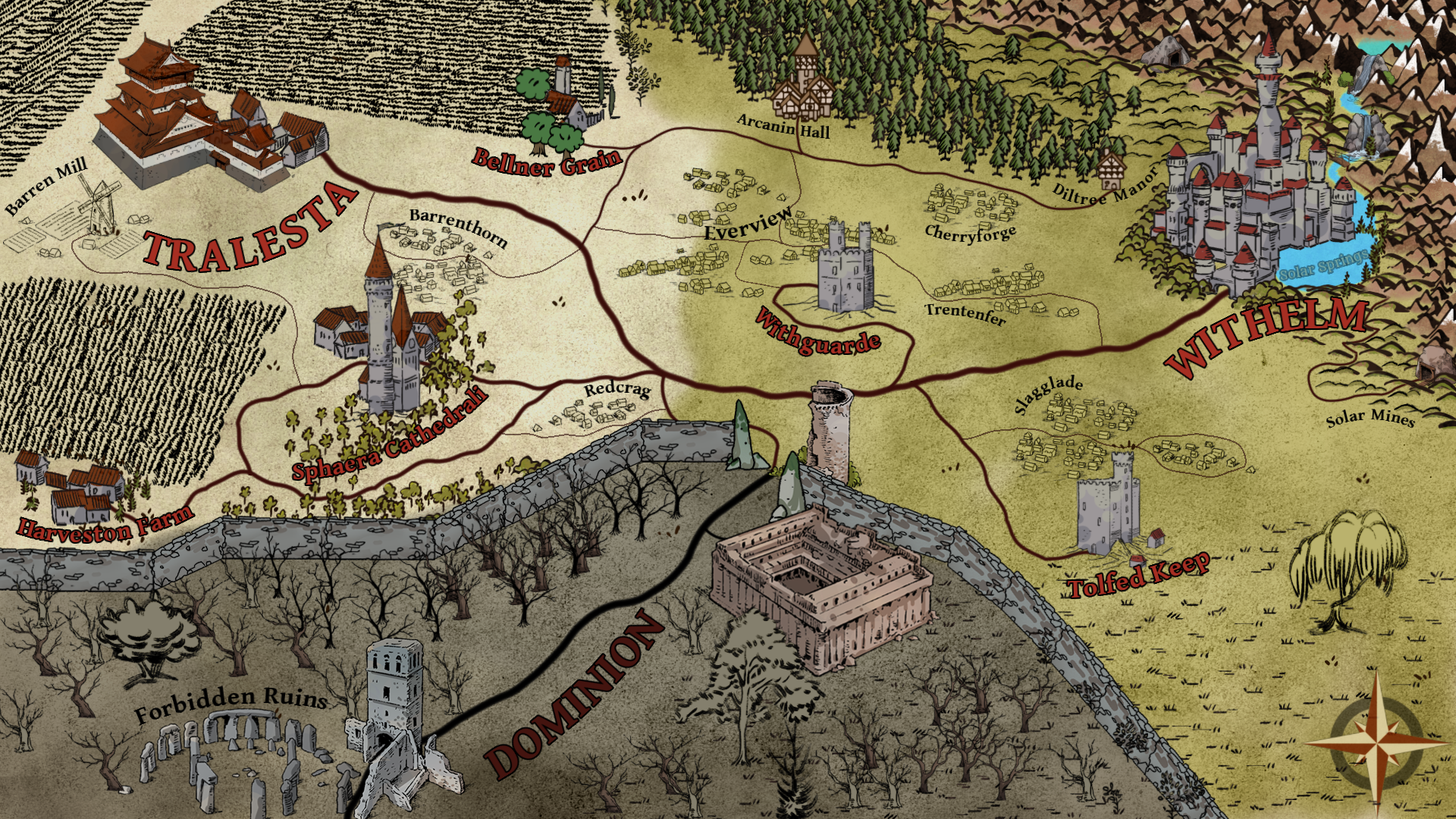 Your characters can have backstories from anywhere in the solar plains. If anyone wants to be an outlander of some kind you can make your character be from the Blistering Sands, a region just west of the Solar Plains. Pretty much a wasteland but it’s where wanderers tend to end up when they want to live away from society. It’s scorching hot and wanderers pretty much depend on hidden caves and occasional rain in order to make a go of it out there. There are also the mountain ranges behind Withelm. They are under constant watch from Withelmian guards because the natural Solar Springs come down from the mountains and the water is their primary resource and export. They don't take kindly to folk messing around in the mountains, but the mountains are quite tall and vast and a wanderer or ten has been known to get around without too much hassle.