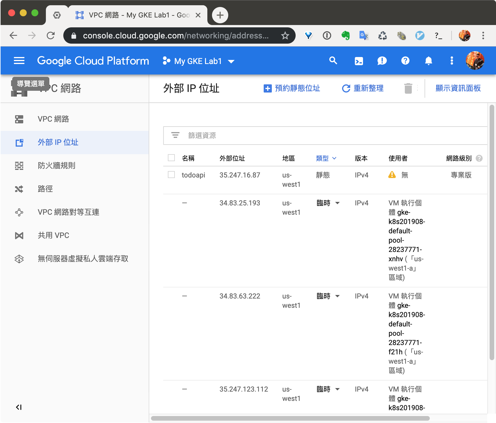 # reserve a new static external IP address for backend todoapi % gcloud compute addresses create todoapi --region=us-west1 --network-tier=PREMIUM # make sure the static external IP address has been allocated % gcloud compute addresses listPlease remember