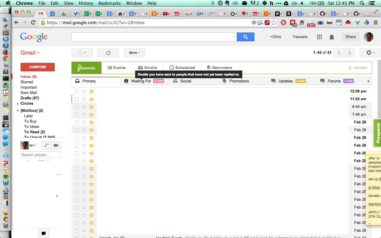 - A Chrome extension that adds a 'waiting for' tab to gmail. I want to see all the emails in 'waiting for' that I haven't received replies to.